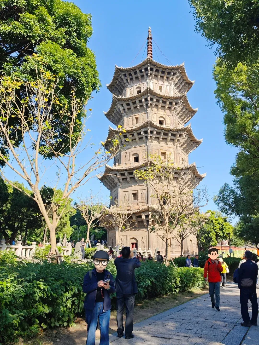 元妙观始建于西晋太康年间(280-289年),初名白云庙。唐代更名中兴观,宋大中祥符年间改称天庆观,元贞元年(1295年)改名玄妙观,清康熙七年(1668年)为避圣祖玄烨之讳,易名元妙观并沿用至今。主要奉祀三清尊神、玉皇大帝等道教诸神。复建后的元妙观为古典宫殿式建筑,融道教文化和闽南古建筑工艺于一炉。台阶前有九龙腾飞云石雕,前檐六根雕龙石柱工艺精湛,整座建筑以二十八根石柱象征四灵二十八宿。凌霄殿同样气势恢宏,屋脊上装饰有剪瓷粘贴的龙、八仙、仙人等图案,色彩绚丽。元妙观历来是闽南道教的活动中心,明、清两代管理道教事务的道纪司均设在观内,闽南地区道士授箓升职和道教徒皈依传度也在观内举行,是泉州道教传播海外的祖庭之一。不知不觉一个早已经打卡了八个寺庙,走了一个早上。又是到了该吃饭的时候……午饭就是是福建特色小吃,蚝烙和面线糊。蚝烙平时也是经常可以吃到的。面线糊还是第一次吃,传说如果不赶紧吃,它就会无限繁殖,根本吃不完。😂午饭后还有行程,这一天真的是走不完了。没过多久,西街到了。突然,雪雪带我来到一家奶茶店,忘了霸王茶姬还是喜茶,我以为可以歇歇脚喝杯奶茶了,结果雪雪说:楼顶有一个机位,可以拍到开元寺的双塔。后面因为网红机位人太多,没有抢到好位置,拍了双塔意思意思就走了。沿着西街一直走,直到来到开元寺。泉州开元寺,位于福建省泉州市鲤城区西街,是中国东南沿海重要的文物古迹,也是福建省内规模最大的佛教寺院。始建于唐垂拱二年(686年),原是大财主黄守恭的桑园,传说因桑树开放白莲花,黄守恭遂舍园建寺,初名莲花道场。长寿元年(692年)改名兴教寺,神龙元年(705年)改称龙兴寺,开元二十六年(738年),诏令全国诸州道各立一佛教寺院以纪年,始称开元寺。寺内有东西两座石塔,均为仿木构八角五层楼阁式石塔。东为镇国塔,高48.24米,建于南宋嘉熙二年至淳祐十年(1238-1250年),塔身80尊佛像代表佛教修行五重境界,须弥座是37幅佛传故事浮雕。这个是西塔吗?