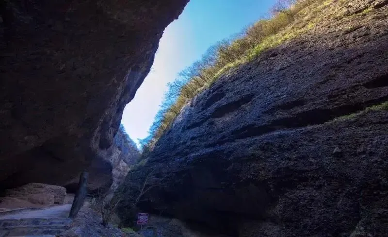 一线天,天设地造,极其美妙。这里只有到中午时分,谷底才能见到一缕阳光,故称为"一线天"。