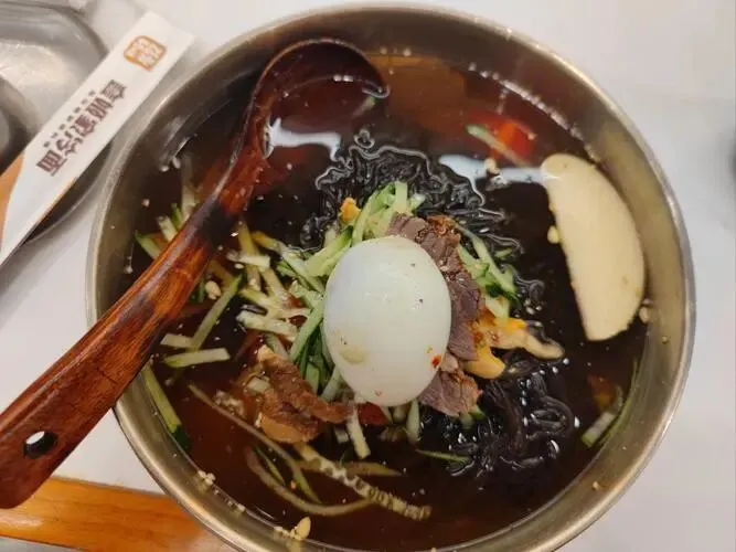 吃的别错过。 延吉冷面一碗下去,嗓子立马透气。 烤五花肉、石锅拌饭、打糕、辣白菜,桌上来一套。 山里再来个榛蘑炖鸡,汤一入口就安稳。