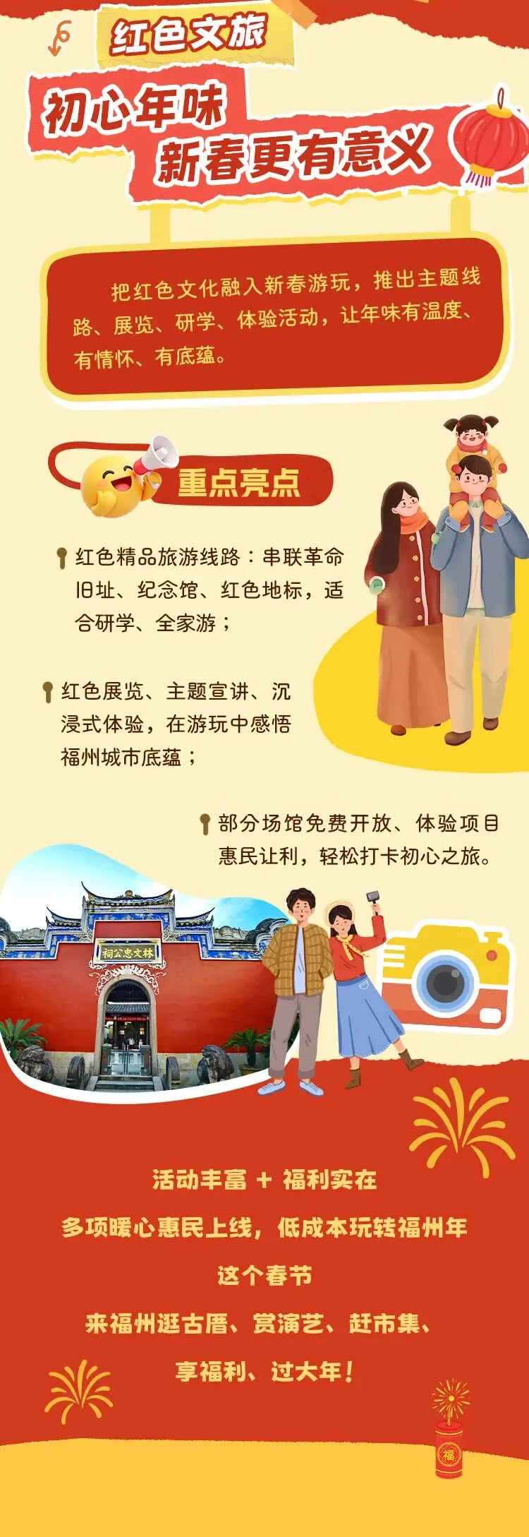 其中,在朱紫坊开展“粉墨辞旧岁,闽韵启新春”闽剧快闪;在三坊七巷水榭戏台开展古厝簪福气・自在过新年——2026新春文艺汇演;在上下杭街区三通桥开展古厝簪福气・自在过新年——2026新春快闪;在福州市美术馆举办福美课堂、福语寄春、寻美古厝、集章拾光、集福领礼、观展赏剧双福利等“美术馆里过大年”新春系列活动。在福州市少年儿童图书馆开展“我们的节日——拓福字·迎吉祥”活动、全息投影体验等活动;在福州市文化馆举办 “文化馆里过大年”2026年新春系列活动之舞狮表演、新民乐表演、漂漆体验、捏泥人、棉花糖、狮子文创展示、冷凝合香制作技艺展示,推出非遗国潮研学体验等活动;在福州市非物质文化遗产展示馆举办新春非遗游园会、“非遗新生”新春非遗活态展示系列活动、“小小非遗推荐官”公益讲解等活动。