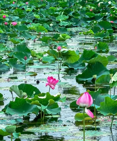 关键是这里不是纯观赏性质的景点,是真的在种莲藕,所以你能看到农民在荷塘里劳作的场景,这种真实感特别珍贵,因为它让你明白美不是专门设计出来给人看的,是在日常生产生活里自然生长出来的。基地里有木栈道可以走进荷塘深处,拍照的角度特别好,但更重要的是那种被荷花包围的感觉,会让人产生一种很平和的情绪。