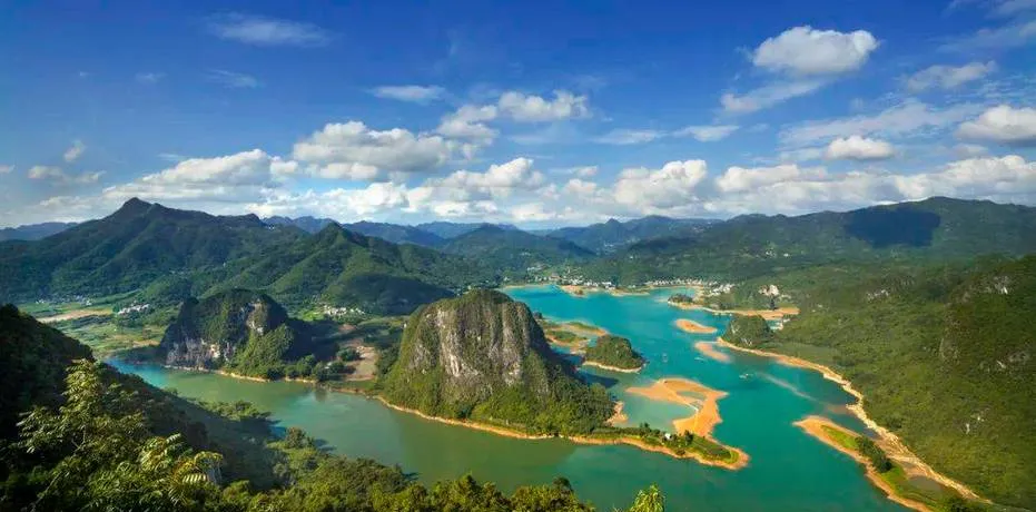 坡豪湖是东兰境内最大的人工湖,很多人听到人工湖就失去兴趣,觉得没有天然湖泊那种野趣,但坡豪湖让你重新理解了什么叫人工和自然的平衡。这个湖是修水库形成的,但经过几十年的自然演化,湖岸线已经长出了茂密的植被,湖水也呈现出那种深邃的蓝绿色,远看跟天然湖泊没什么区别。