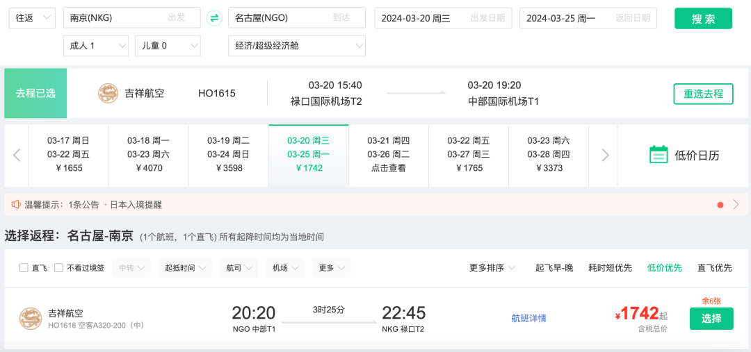 南京=名古屋,直飞往返1k7
