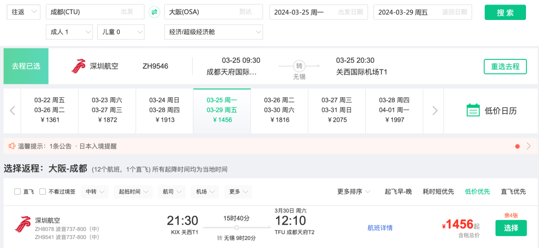 成都=大阪,往返1k4