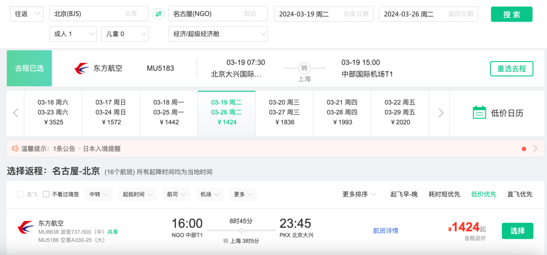 北京=名古屋,往返1k4