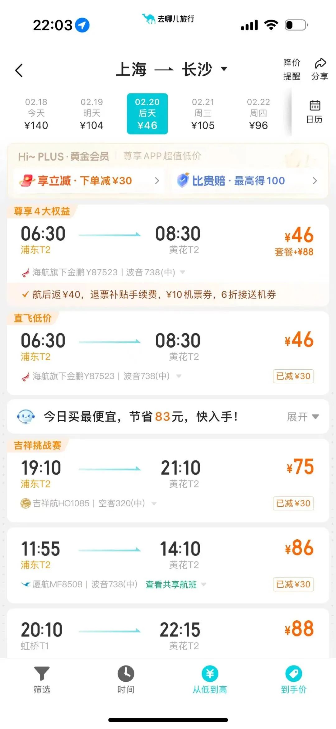 比如像上海-长沙这种反向机票,只要46元