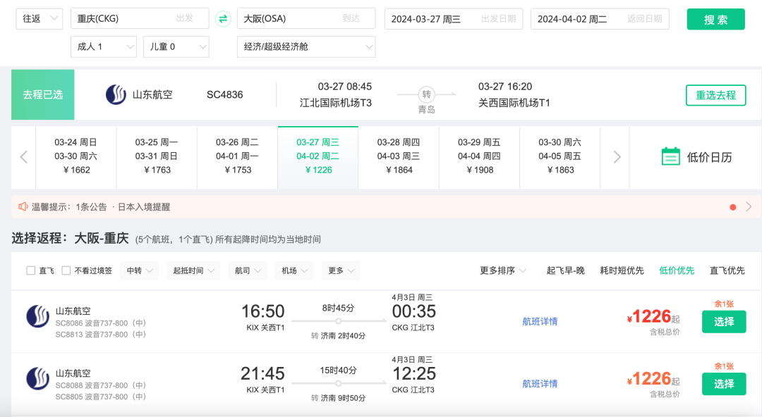 重庆=大阪,往返1k2
