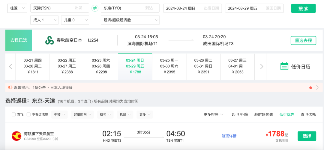 天津=东京,往返1k7