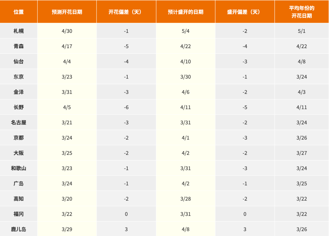 名古屋预计在3月21日开花,3月31日盛开;大阪预计在3月25日开花,4月2号盛开;最晚的札幌预计在4月30日开花,5月4日盛开