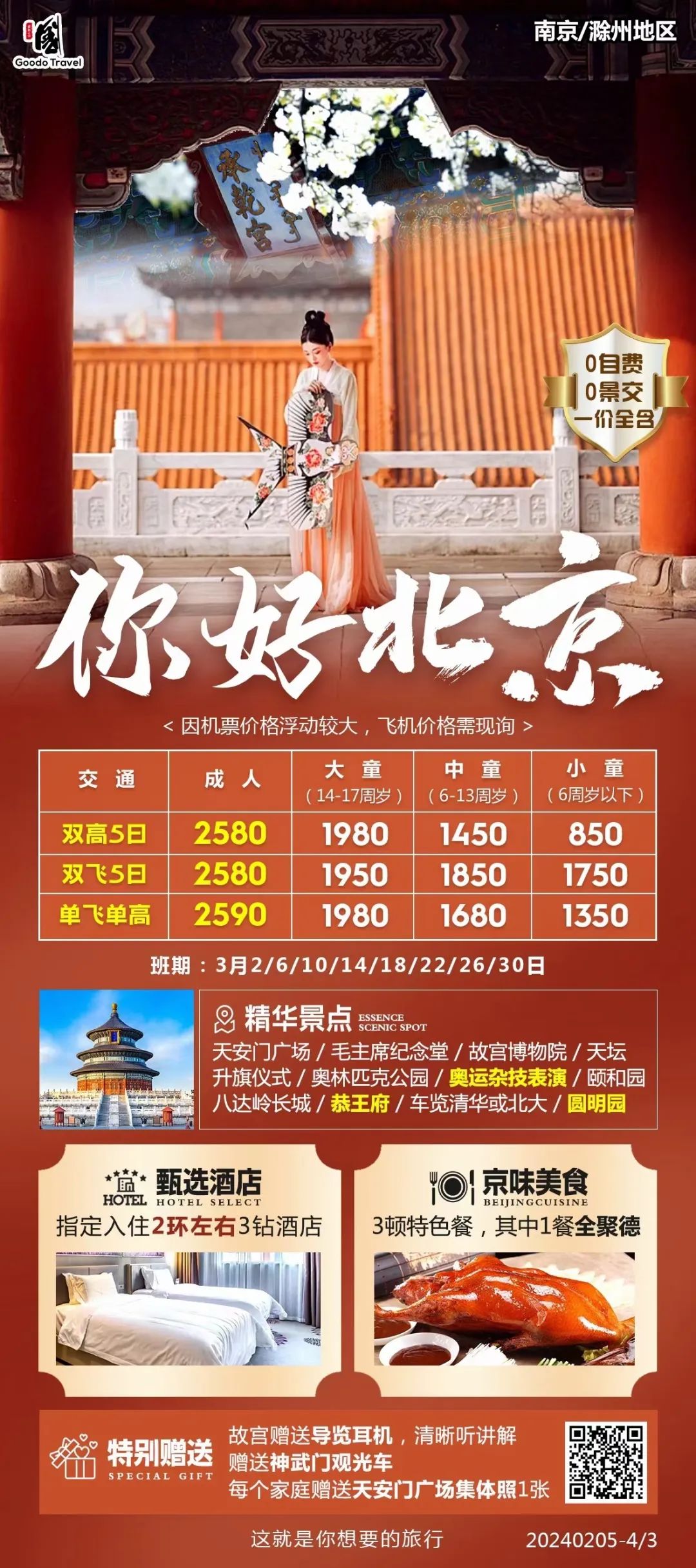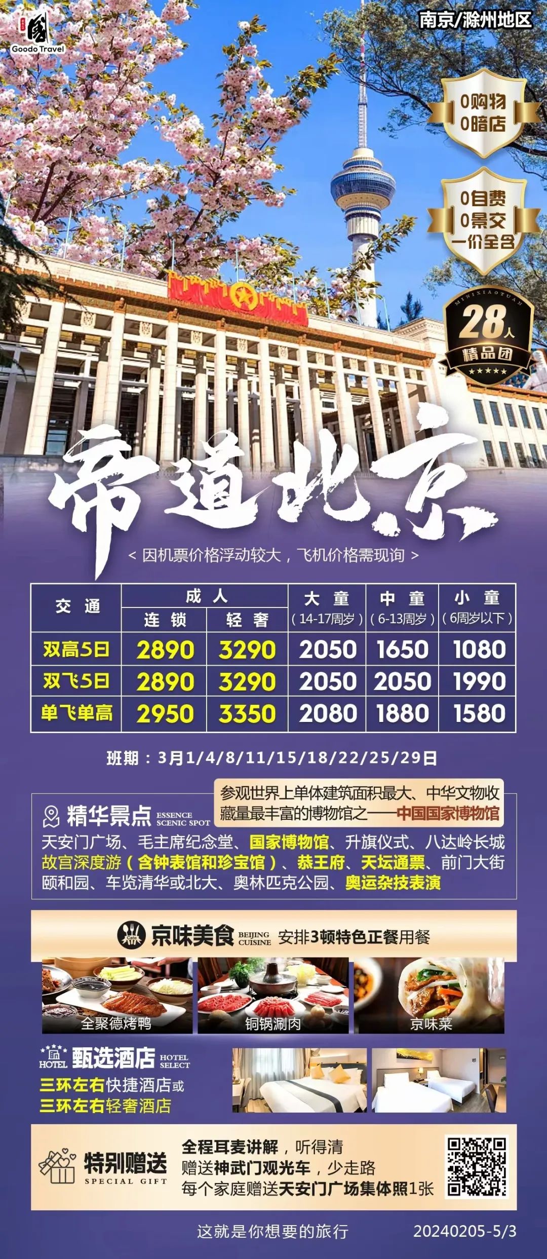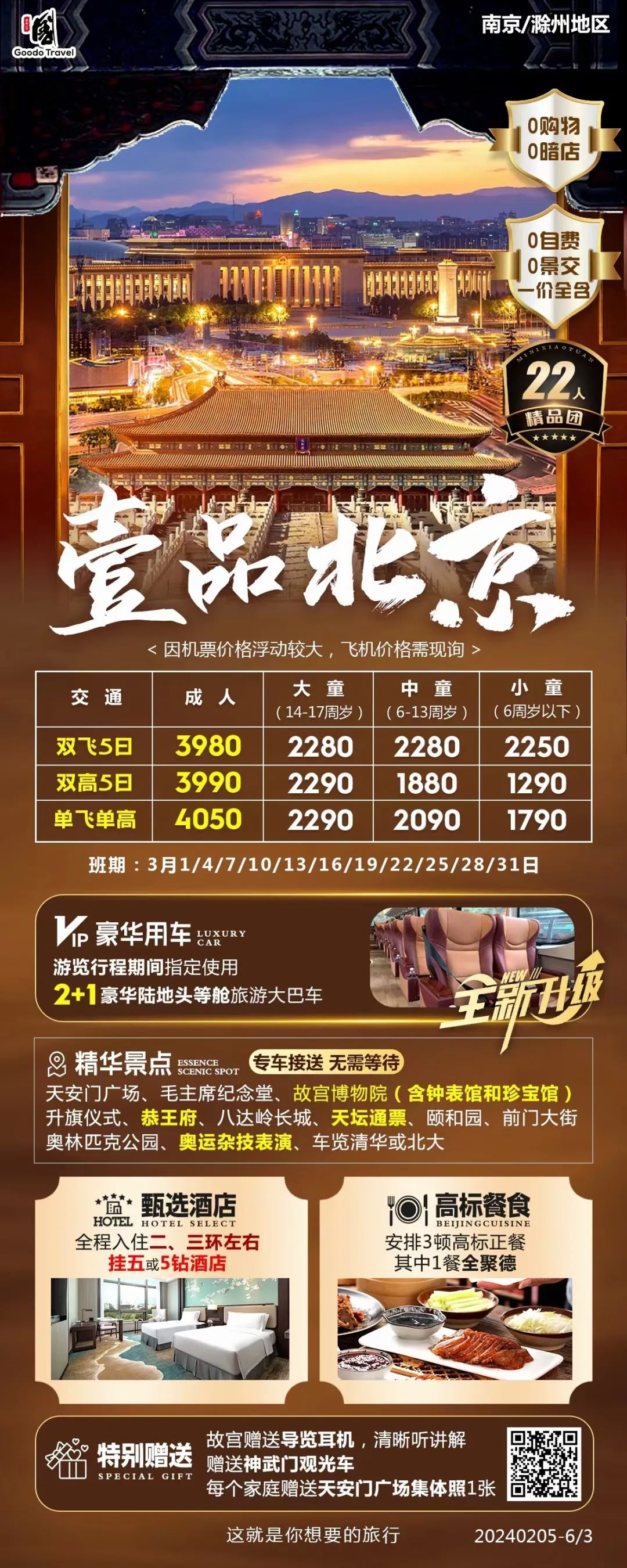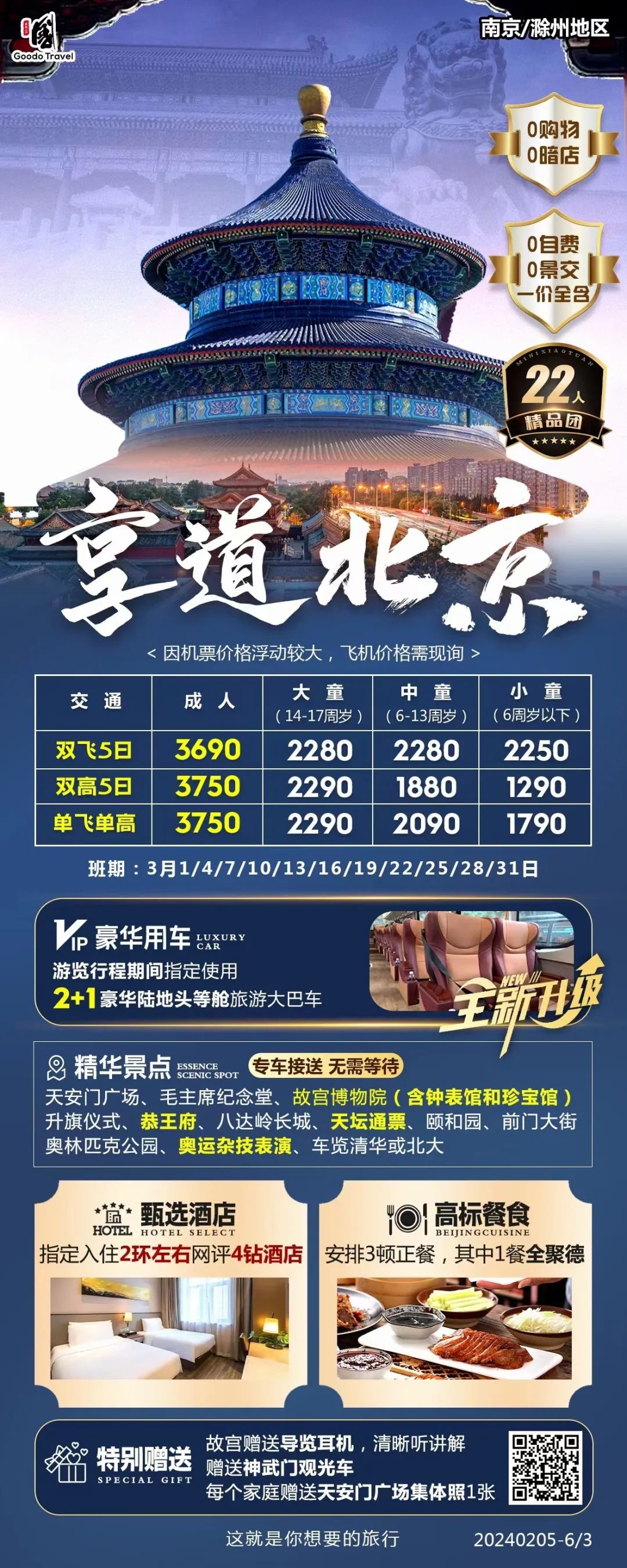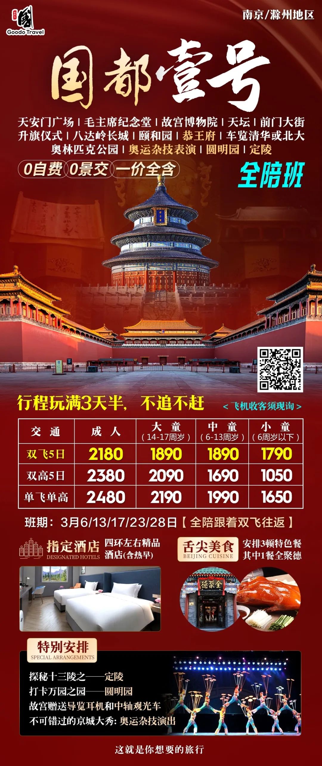 推荐选择双飞往返,俯瞰首都全貌,统一时间大家在南京禄口机场集合,全陪导游协助值机并带大家一起乘坐航班跟到北京,游玩期间全程陪同,最后一天再跟回南京,所以就算第一次乘坐飞机也不用担心。