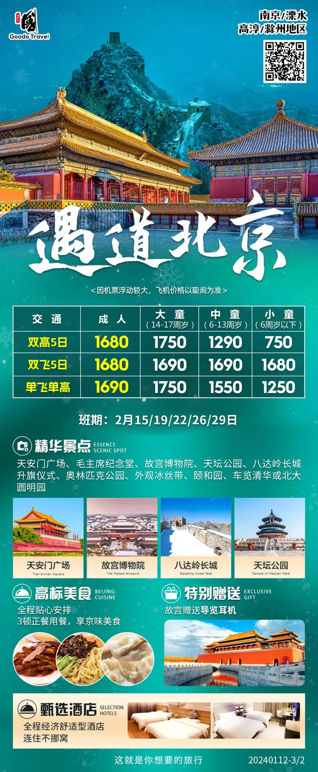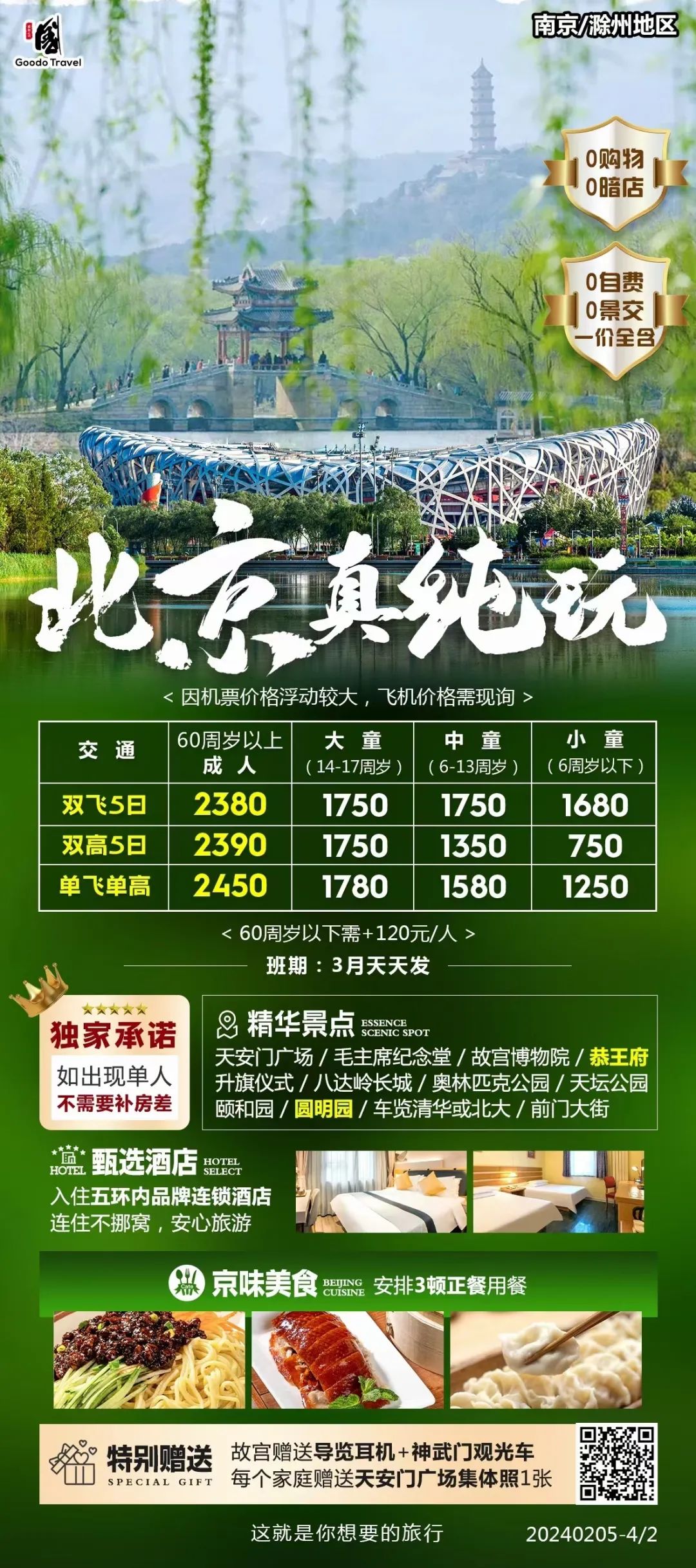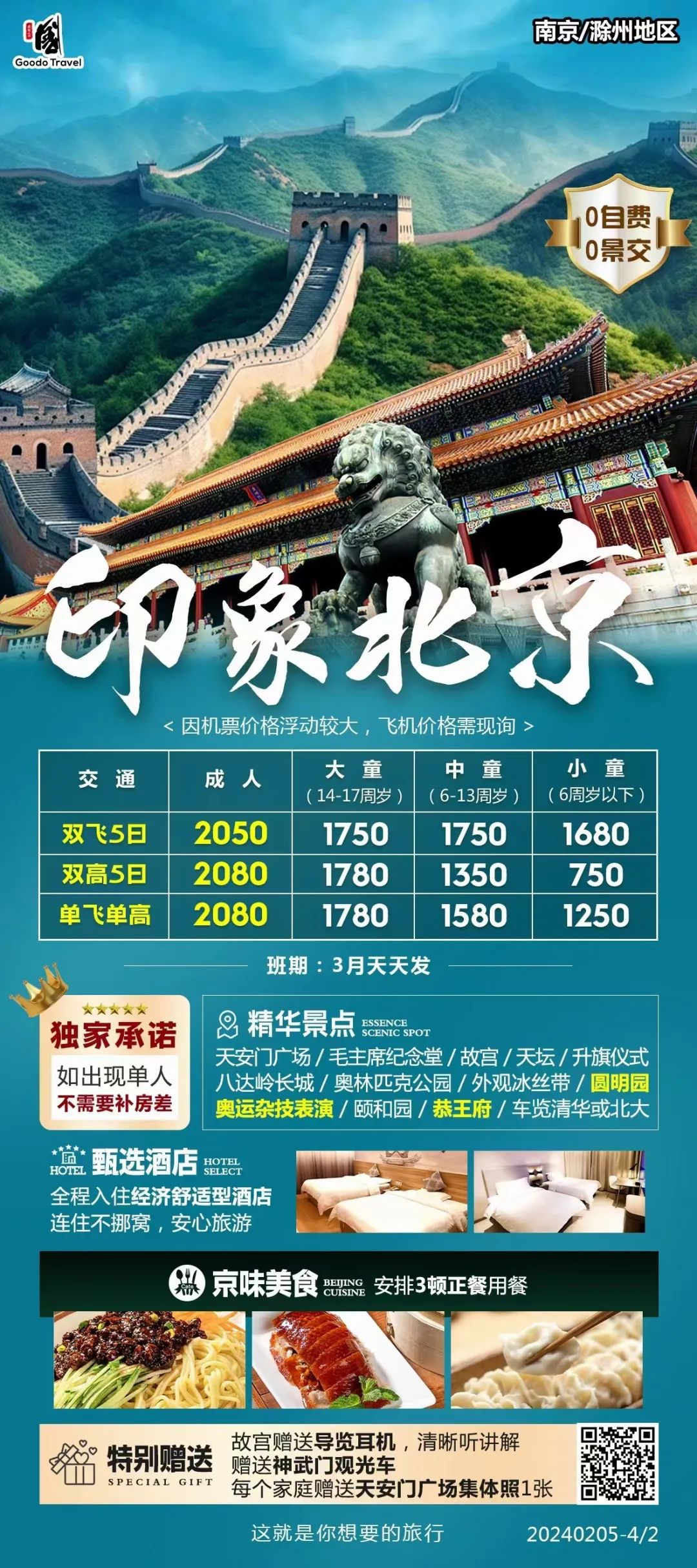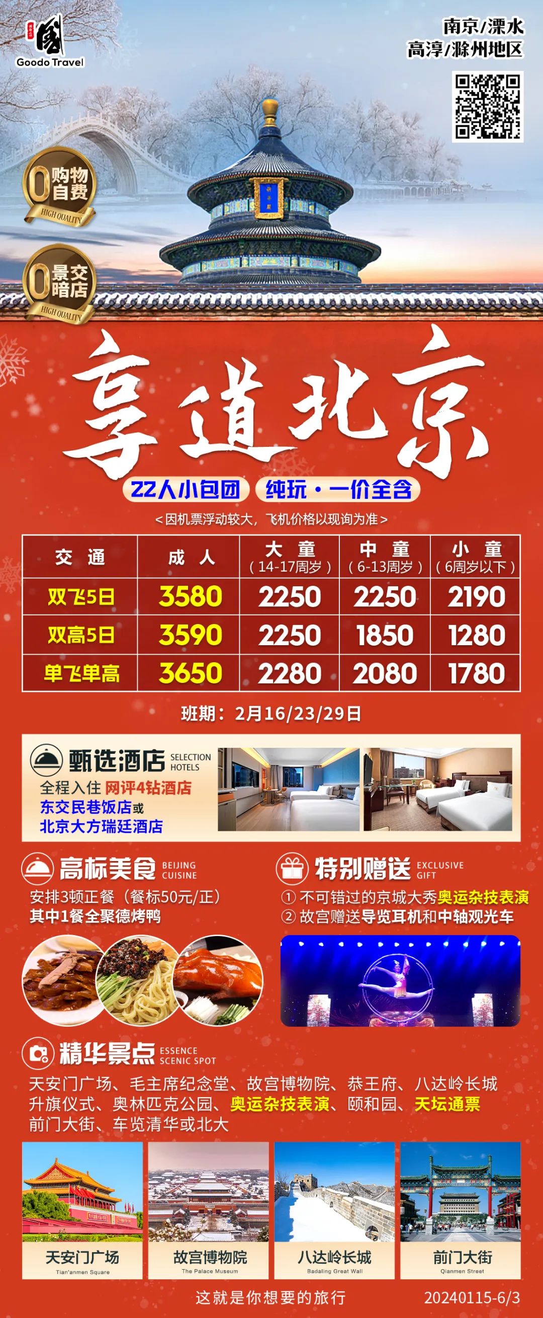 推荐选择双飞往返,俯瞰首都全貌,统一时间大家在南京禄口机场集合,全陪导游协助值机并带大家一起乘坐航班跟到北京,游玩期间全程陪同,最后一天再跟回南京,所以就算第一次乘坐飞机也不用担心。