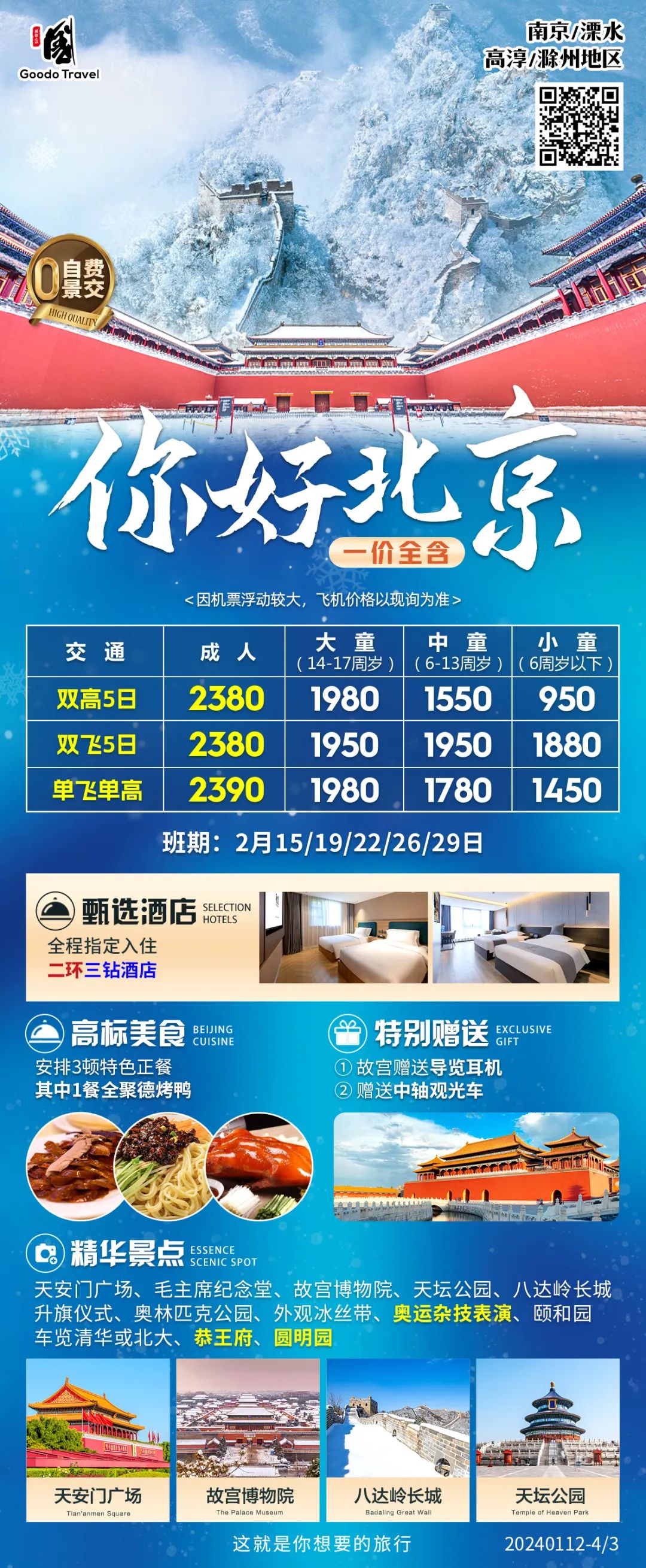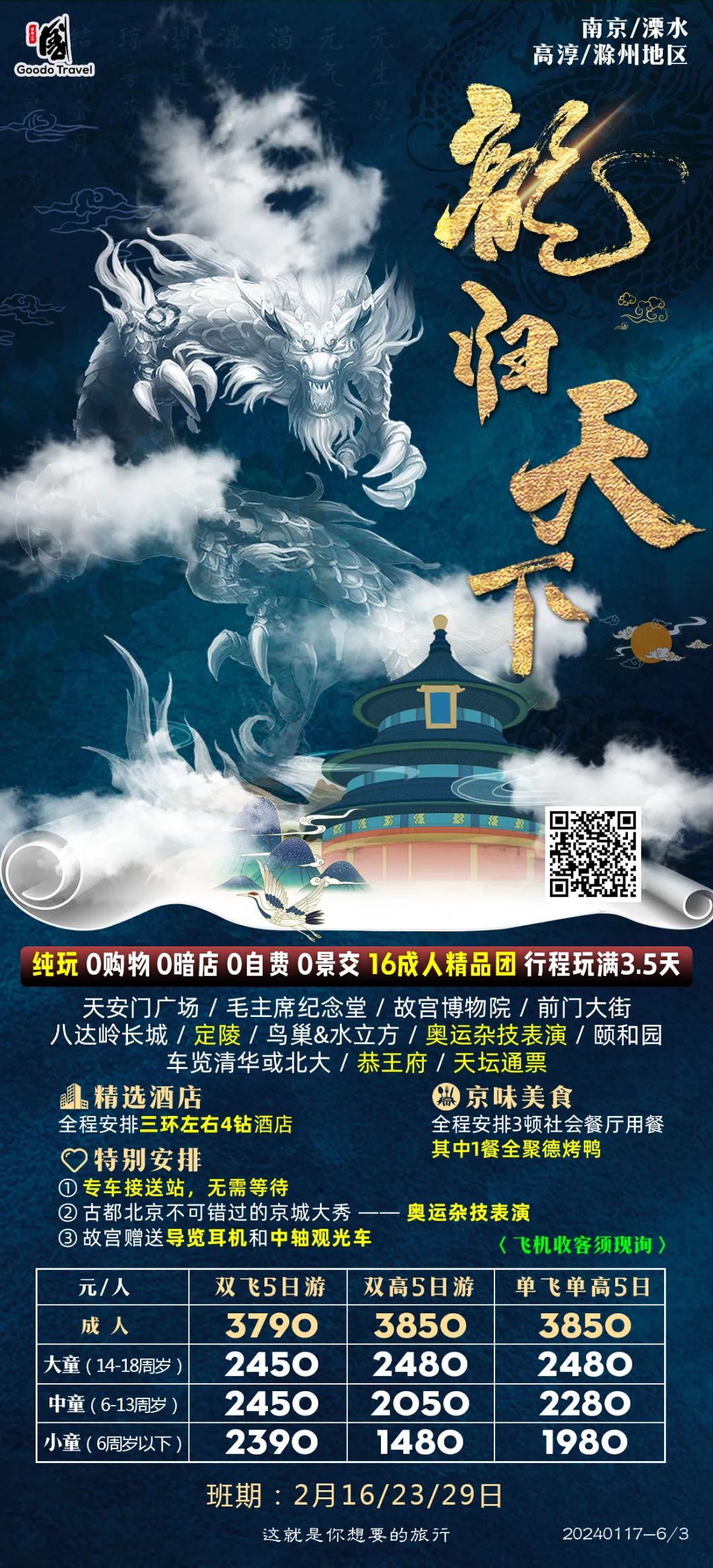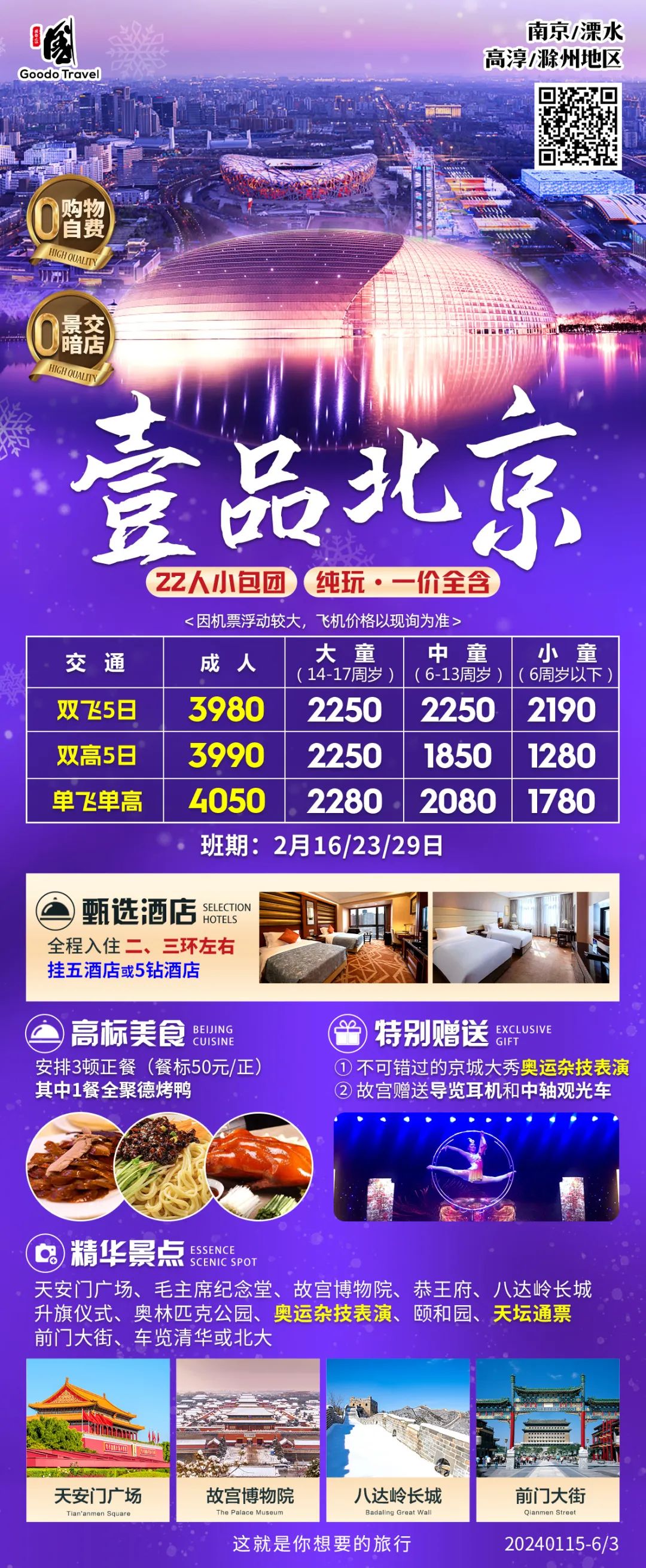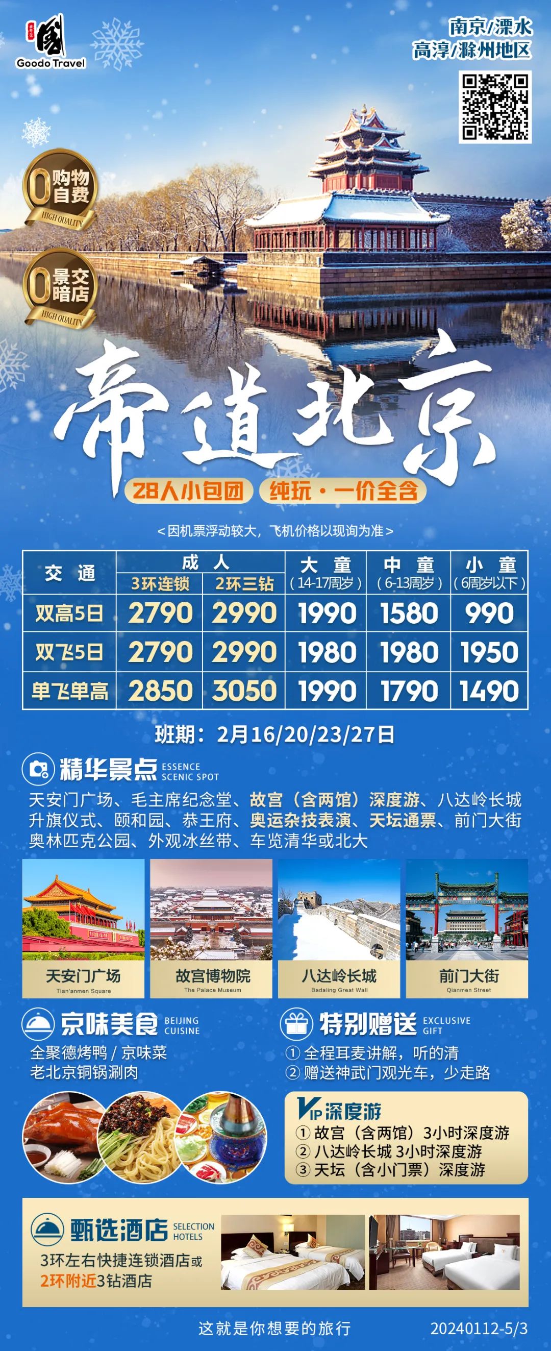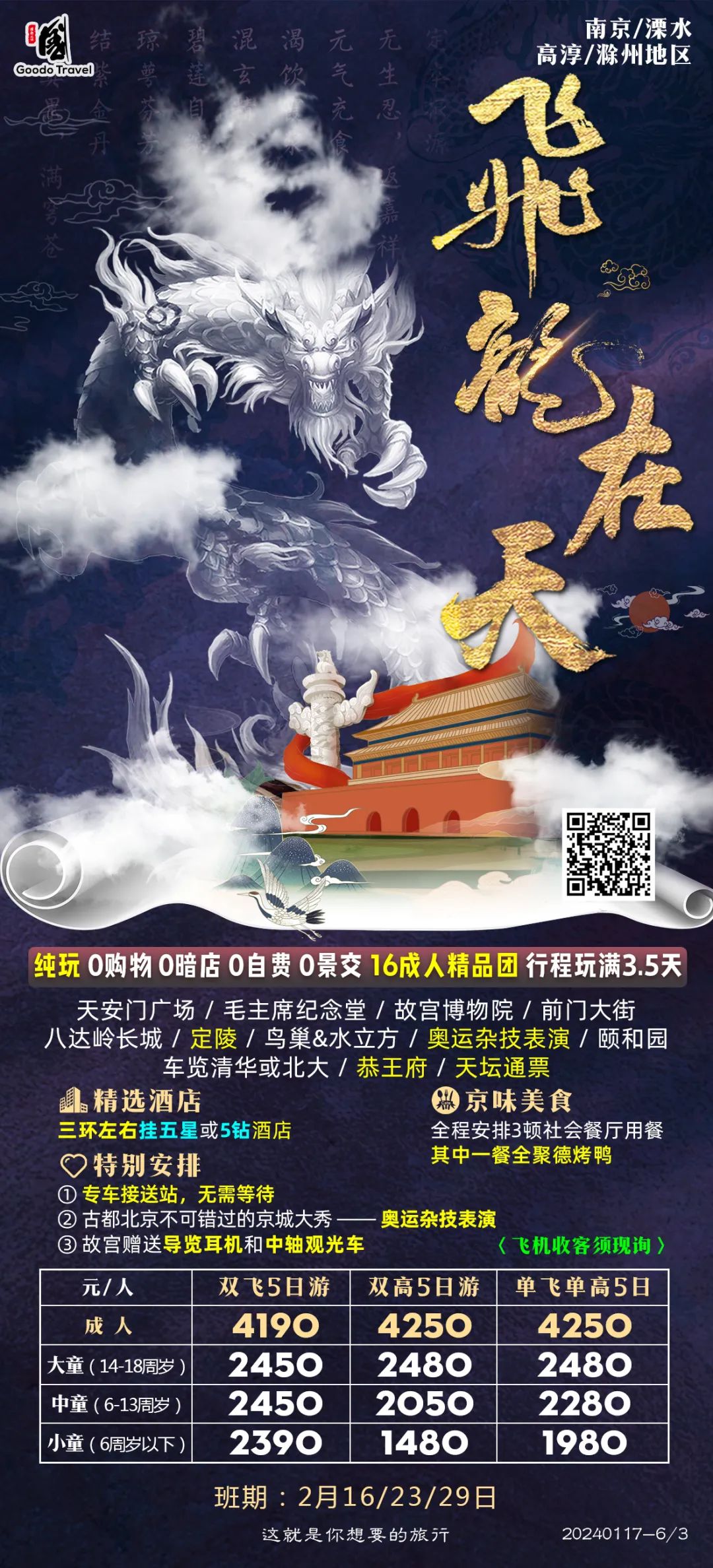 推荐选择双飞往返,俯瞰首都全貌,统一时间大家在南京禄口机场集合,全陪导游协助值机并带大家一起乘坐航班跟到北京,游玩期间全程陪同,最后一天再跟回南京,所以就算第一次乘坐飞机也不用担心。