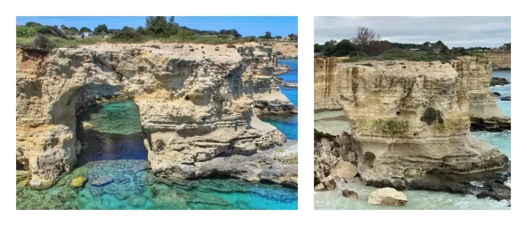 海蚀作用:普利亚区海岸多为石灰岩,本身易被溶蚀。在“爱情拱门”的形成过程中,海浪长期拍打、冲刷海岸线脆弱带(如节理、裂隙),通过磨蚀和溶蚀,先形成海蚀洞,再穿透成海蚀拱桥。这是典型的海蚀地貌。