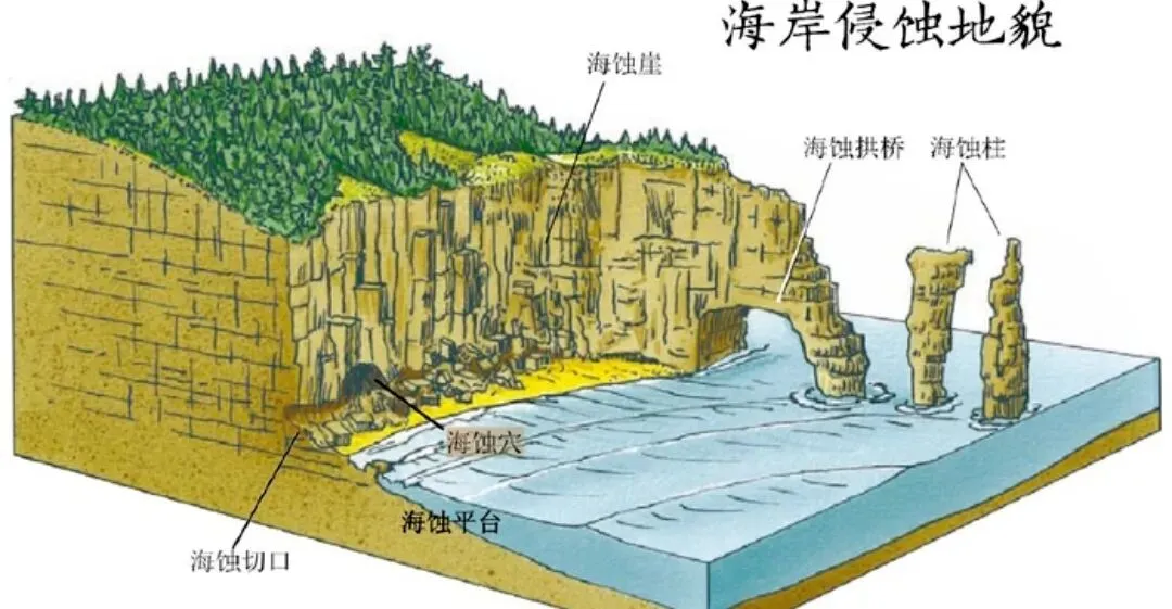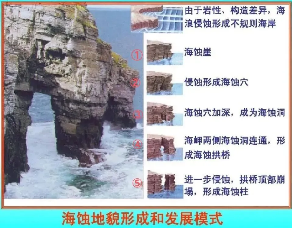 1.外力作用、海蚀地貌:由海蚀拱桥变为海蚀柱:(④→⑤)