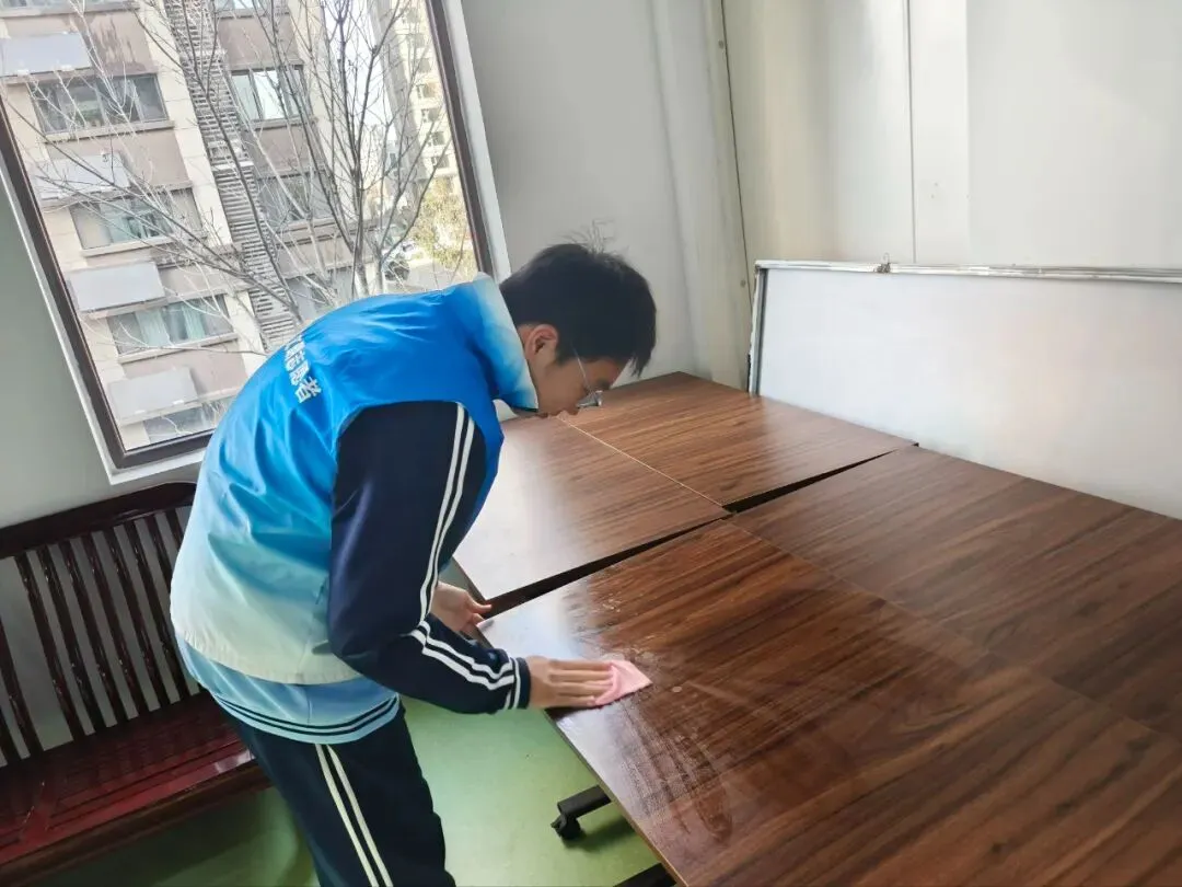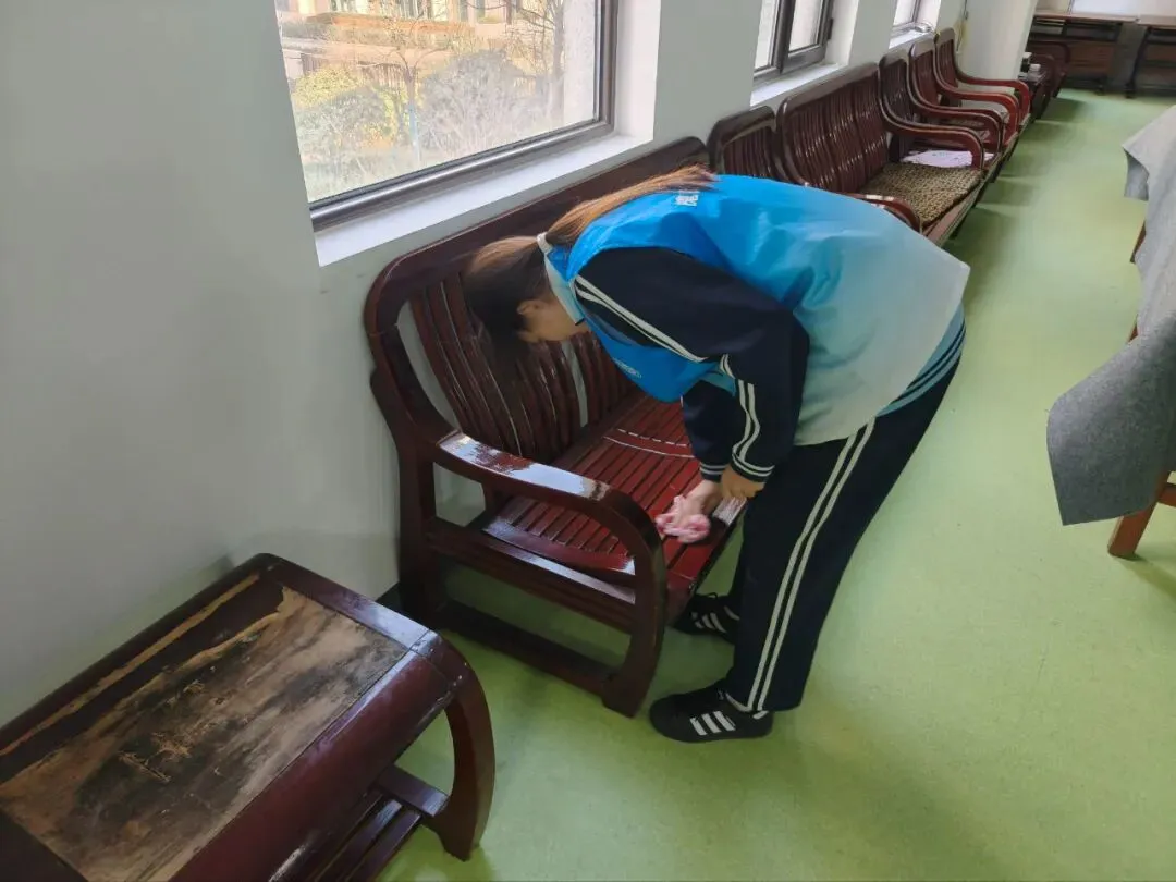 理论学习后,同学们来到社区二楼老年人活动中心,开展环境卫生清洁服务。大家分工明确、细致认真地完成扫地、擦窗、物品整理等工作,彻底清理卫生死角,为老人营造了整洁舒适的活动环境。尽管天气寒冷,同学们依旧热情饱满,用劳动为社区增添温暖,在服务中体会奉献的快乐。