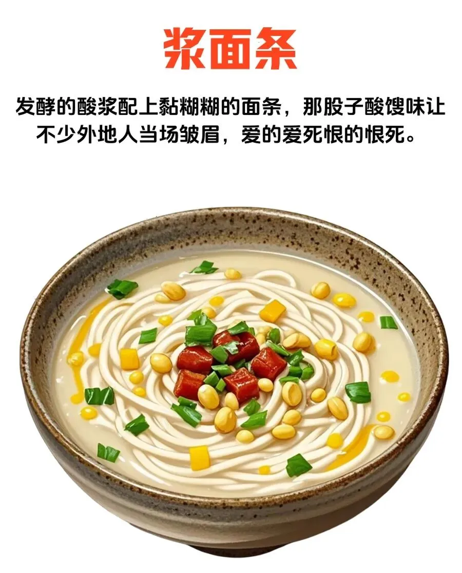 再说浆面条 , 这个更猛 , 发酵绿豆浆煮出来的面 , 酸酸的带股特殊味道 , 本地人觉得开胃得很 , 外地人闻到可能就直摇头了。
