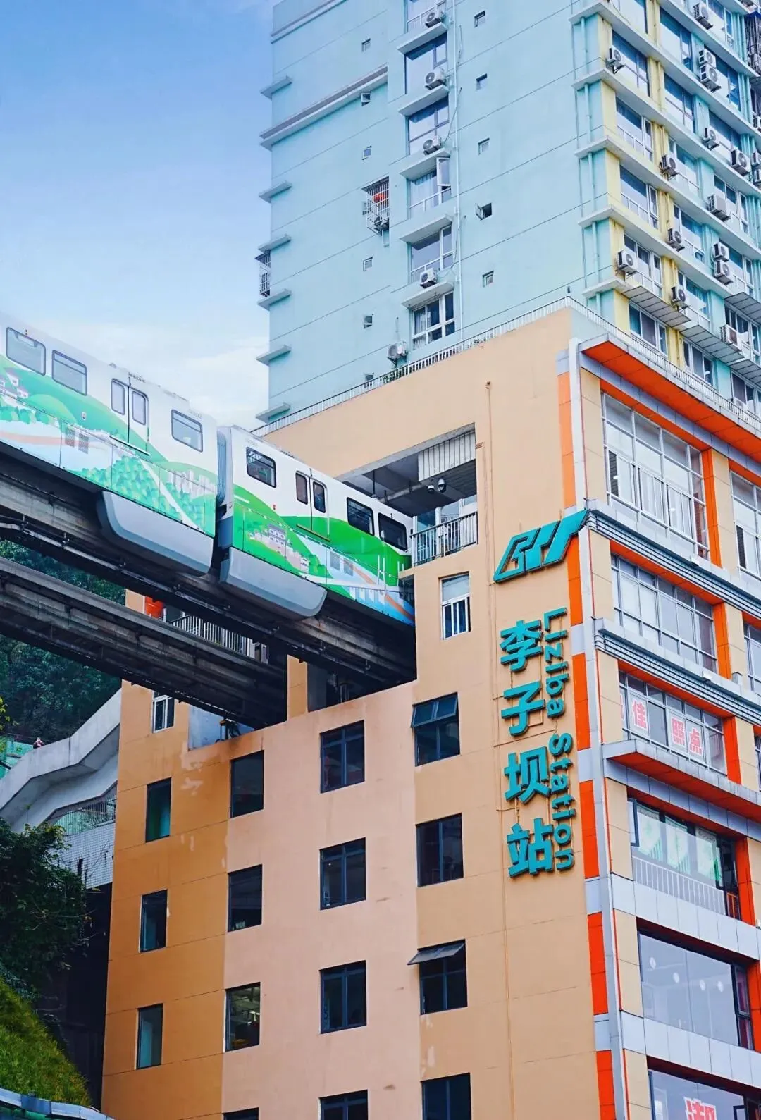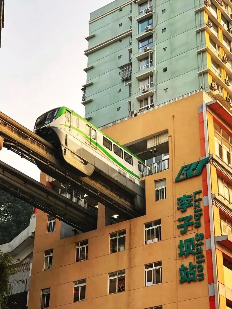 2.李子坝轻轨穿楼:李子坝站(Liziba Station),车站编号207,位于中国重庆市渝中区李子坝正街39号6-7层,是中国国内第一座与商住楼共建共存的跨座式单轨高架车站,由重庆市轨道交通(集团)有限公司管理运营,途经线路为重庆轨道交通2号线。