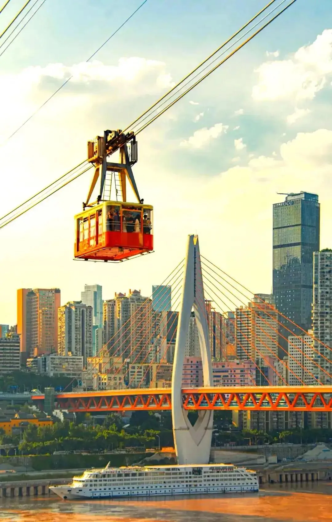 4.长江索道:长江索道连通重庆渝中区和南岸区,景区由渝中城史文化区、长江空中观光区、南岸影视文化区三部分组成,面积9.8平方千米。长江索道全长1166米,运行速度6米/秒,单程运行时间4分30秒,最大载客量65人,日运客量1.05万人次。