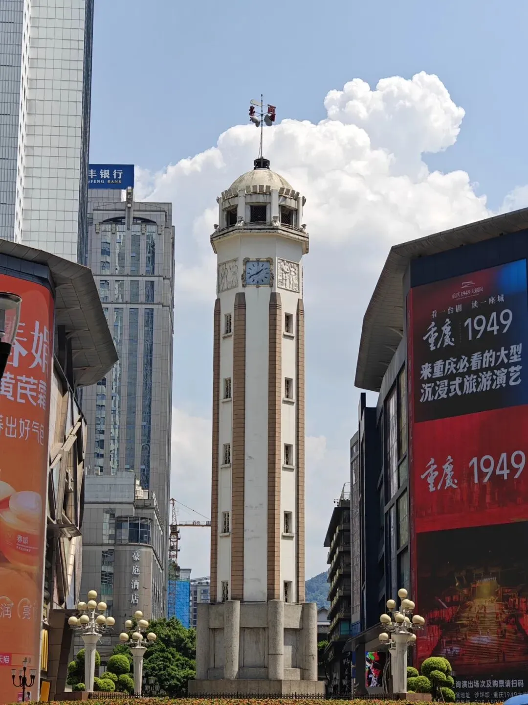 9.解放碑:抗战胜利纪功碑暨人民解放纪念碑正面向北偏东,为八面柱体盔顶钢筋混凝土结构,碑通高27.5米,边长2.55米,碑内连地下共八层,设有旋梯达于碑顶,碑顶向街口的四面装有自鸣钟,碑台周围为花圃,总占地面积62平方米,保护范围面积642平方米。该处是中国人民反法西斯战争取得胜利的象征,也是重庆解放及重庆市的象征。
