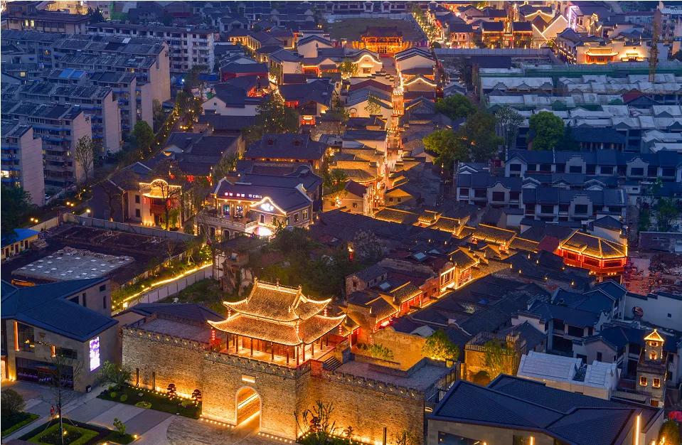 鸠江区的鸠兹小镇45万方徽派建筑群气势恢宏。夜晚万盏灯彩亮起,《悟道徽商》实景演出、打铁花、火壶表演轮番上演,非遗文化活灵活现。