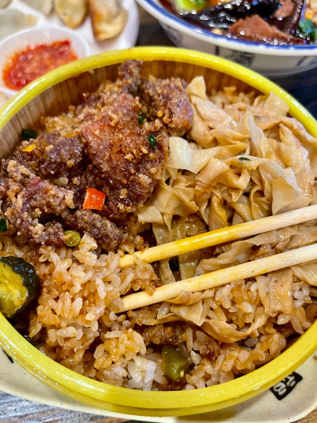 古时芜湖是"四大米市之一",米饭地位不可忽略。渣肉蒸饭是粉蒸肉与米饭的强强联合,肥瘦刚好的肉配粒粒分明米饭。香而不腻,饱腹感强,本地人早餐常选。