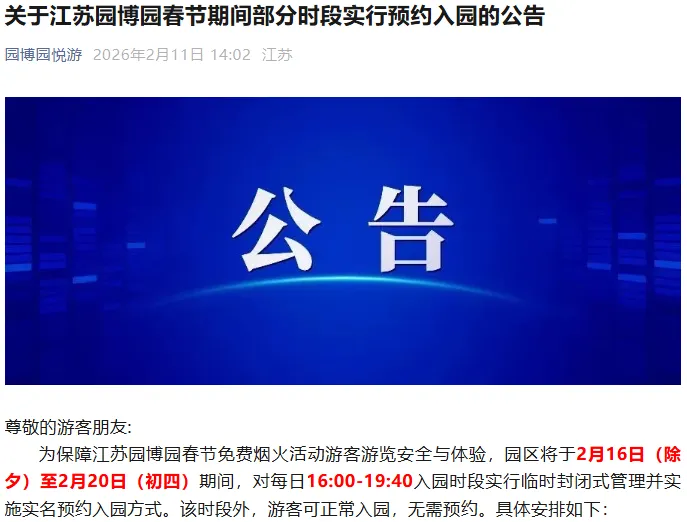 此前,2月11日,景区曾发布《关于江苏园博园春节期间部分时段实行预约入园的公告》。