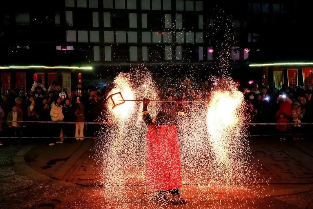 非遗身份:传统技艺类非遗展演时间地点:2月17日—23日,海窝子古镇“非遗贺新春·古镇过大年”咋个办:春节期间唱川剧、耍龙灯、耍狮拜年、踩高跷表演、鱼灯巡游;最引人注目的夜里打铁花,非遗匠人把熔化的铁水泼向高空,炸开满树金花。本地人小时候怕烫,现在只觉得暖。火舞秀演员举火把穿巷而过,像古代报信的驿卒。还能NPC集章、学非遗手作——皮毛也是手艺。