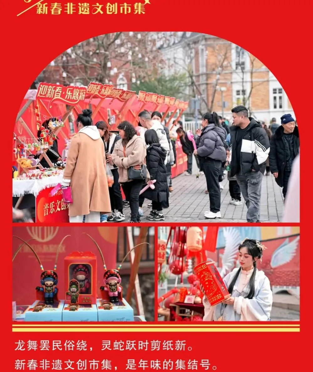 新年活动区摸福字、挂红绸,老人笑得眯起眼。手工艺品区高手扎堆,面人捏的孙悟空、剪纸剪的胖锦鲤,十块钱就能把非遗带回家。