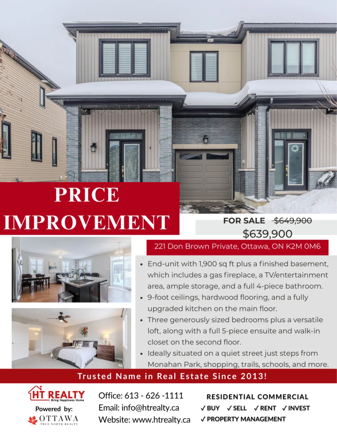 位于 Ottawa Kanata 区的 221 Don Brown Private,端头联排现已价格优化,机会难得!
