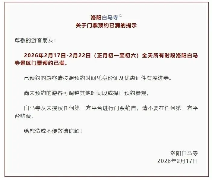 洛阳白马寺作为著名的佛教圣地,向来吸引着众多游客前来参观。2026年2月17日 - 2月22日(正月初一至初六)全天所有时段的门票预约都已爆满。景区提醒已预约的游客要按照预约时间凭身份证及优惠证件有序进寺,而尚未预约的游客则需要调整其他时间段或择日预约参观。