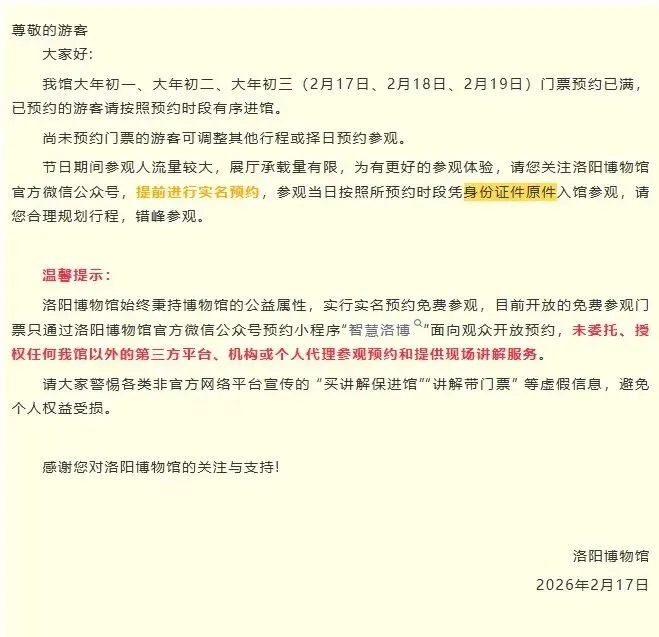 洛阳博物馆同样在春节期间受到游客的热捧。大年初一、大年初二、大年初三(2月17日、2月18日、2月19日)门票预约已满。已预约的游客需要按照预约时段有序进馆,尚未预约门票的游客则要调整其他行程或择日预约参观。