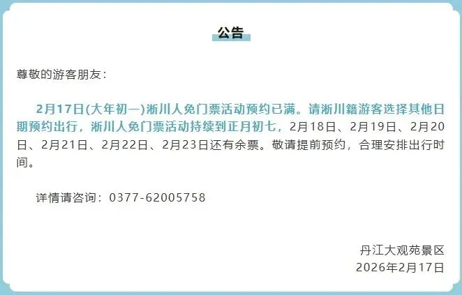 丹江大观苑在2月17日(大年初一)的淅川人免门票活动预约已满。景区提醒淅川籍游客选择其他日期预约出行,因为淅川人免门票活动持续到正月初七,2月18日、2月19日、2月20日、2月21日、2月22日、2月23日还有余票。