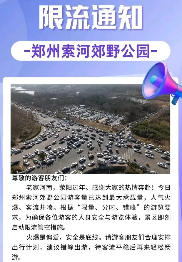 2月17日,郑州索河郊野公园游客量达到了最大承载量,出现了人气火爆、客流井喷的情况。根据“限量、分时、错峰”的游览要求,为确保各位游客的人身安全与游览体验,景区即刻启动了限流管控措施。