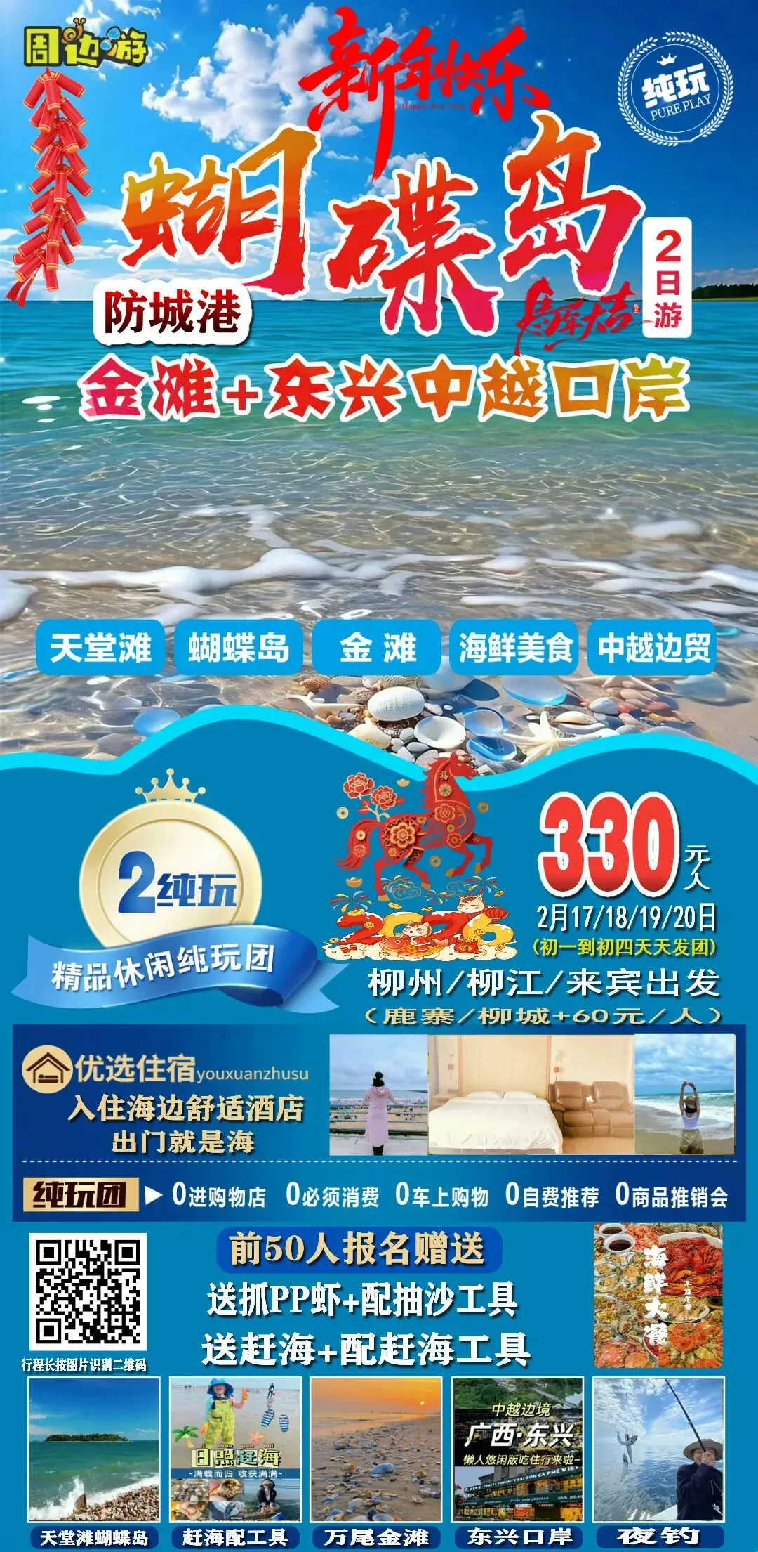 2月19日(年初三,已经成团有位)防城港蝴蝶岛天堂滩+万尾金滩+中越口岸纯玩2日330元/人