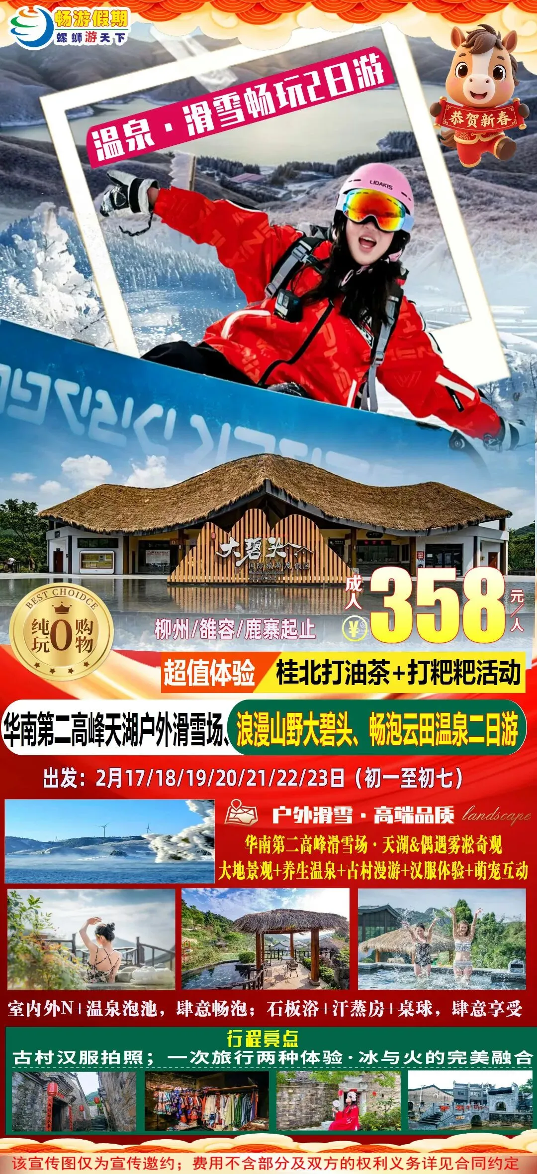 2月21日(已经成团,有位)全州天湖户外滑雪场、大碧头云田养生温泉纯玩二日游358元/人(不含滑雪门票,滑雪票自理)