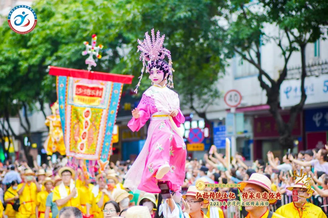 在番禺区,每年的农历三月初三,到沙湾看飘色巡游是一大特色节目。沙湾飘色巡游是番禺区历届民俗文化节的重头戏。按照习俗,当天清晨,来自沙湾街东、南、西、北四条村的村民便纷纷抬出本村自主创作的飘色作品,往留耕堂广场集中。在巡游方阵里有鳌鱼舞队、舞狮队、彩龙队等,都是由来自沙湾各中小学的学生仔表演,其中最惹眼的是“色仔”“色女”造型各异,萌态可爱,象征着非遗传承力量的生生不息。