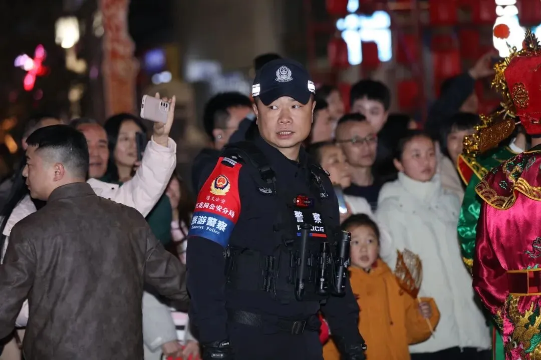 旅游勤务聚焦红花岗区红色地标及老城步行街、公园路等文旅核心区域,实行定点值守、动态巡防相结合的模式,显性用警、全域防控。执勤民辅警坚守岗位、恪尽职守,全天候开展景区秩序维护、安全隐患排查、矛盾纠纷调处和突发事件应急处置,同时主动为游客提供路线指引、旅游咨询、物品遗失查找等便民服务,用脚步丈量平安,用坚守守护团圆。