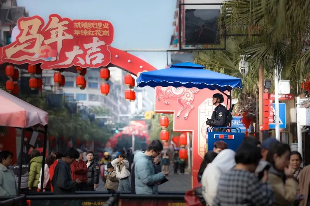 新春启序,年味渐浓。2026年春节期间,红花岗区以“骐骥跃遵义·年味红花岗”为主题,打造特色文旅场景,吸引众多游客前来打卡畅游。为守护群众平安过节、游客舒心出行,红花岗公安分局旅游警察队伍,以忠诚履职筑牢平安防线,用暖心服务传递公安温度,让“警”色与年味相融,成为新春最动人的风景。