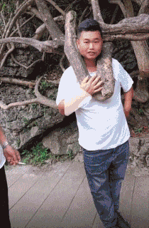 钻到树杈中间拍照被卡住的小伙,自己成为了景点,笑容渐渐凝固