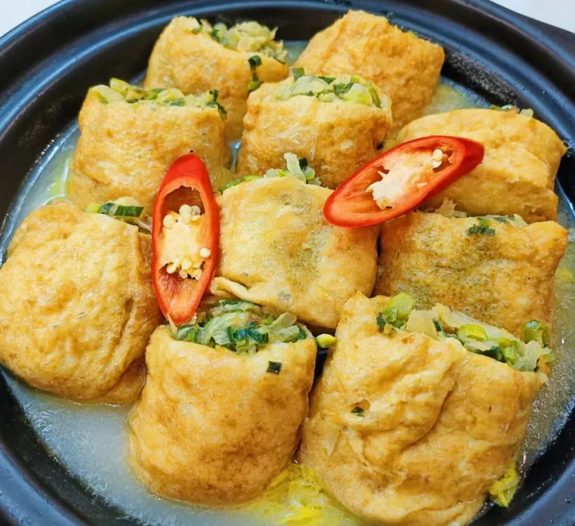 品尝煎得金黄的酿豆腐,外皮酥脆、内馅鲜香,吸满汤汁超下饭,配米饭满足感十足。