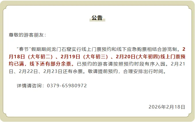 龙门石窟2月18日、2月19日、2月20日线上门票预约已满,线下还有部分余票。已预约的游客请按照预约时段有序入园。2月21日、2月22日、2月23日还有余票。