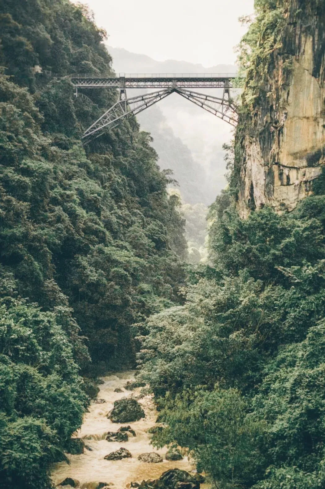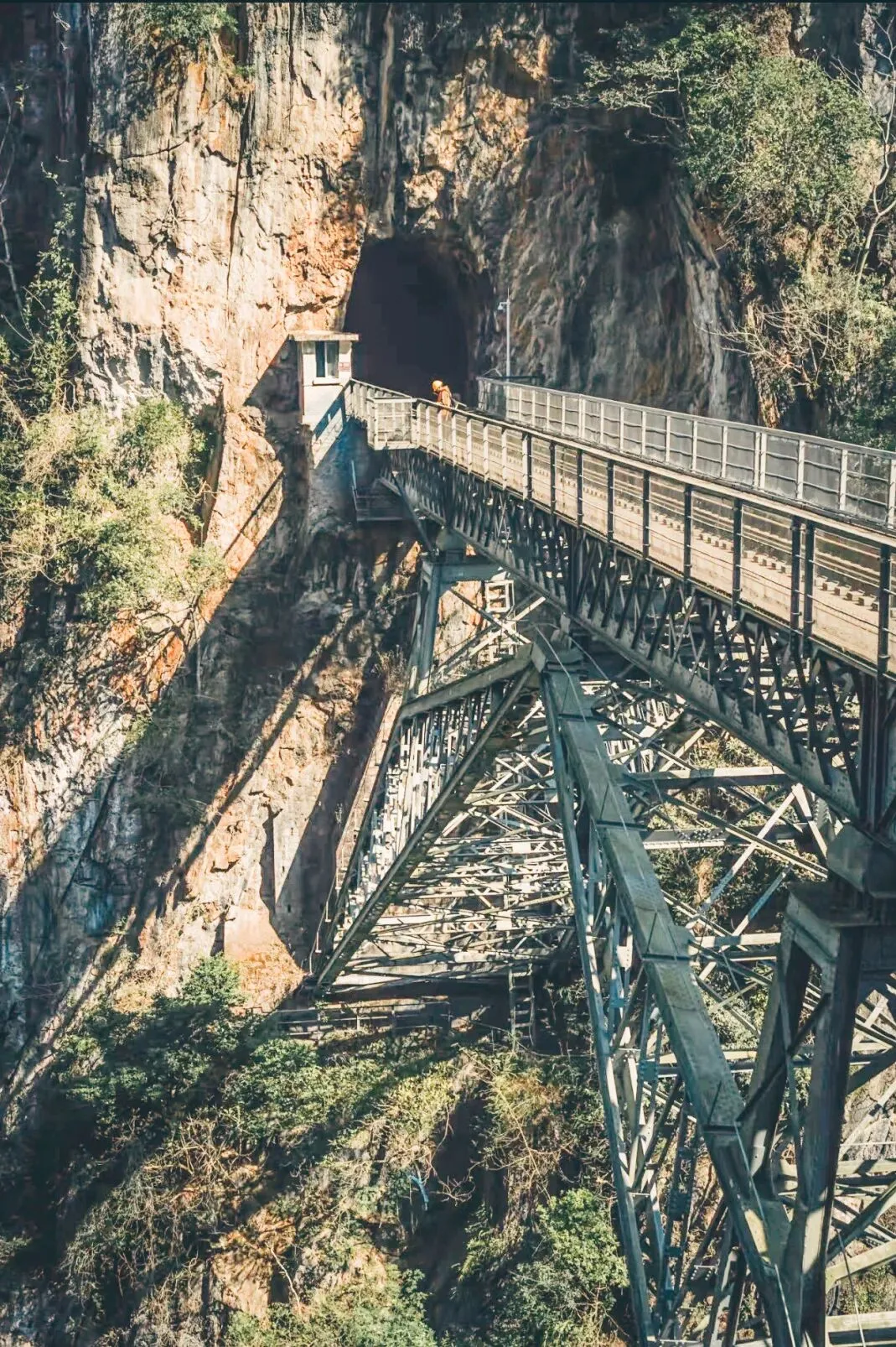 它看着非常轻。六十七米长的钢铁结构悬在百米峡谷之上,像一只收拢翅膀的鹰。但118年过去,桥上的铆钉没有一颗脱落,阳光穿过钢梁,在谷底投下精密的光影。