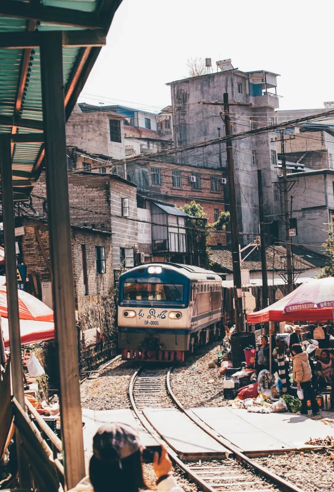 10点刚过,远处传来汽笛声。人群自动往两边退,让出一条窄窄的通道。火车慢悠悠开过来——慢到可以和司机对望,慢到车厢上斑驳的法文厂牌清晰可见。它轰鸣着驶过摆着芒果的竹筐、挂着腊味的竹竿、堆成小山的山货。