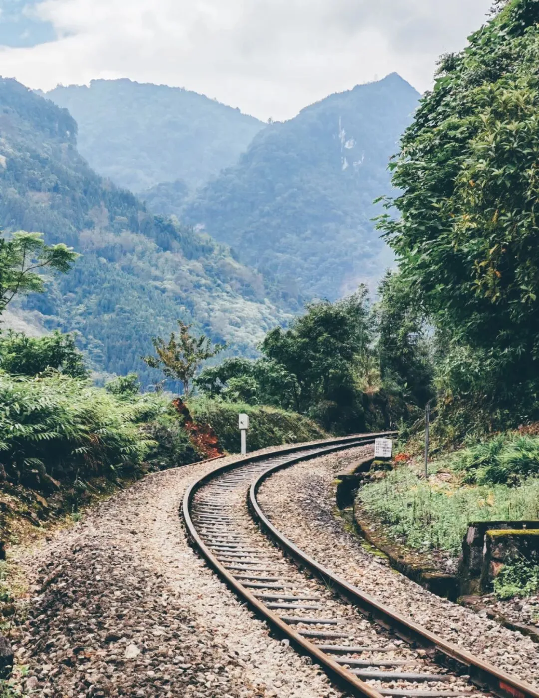 车停在山脚,步行往上。铁轨沿着绝壁蜿蜒,有些枕木已经朽了,缝隙里长出细小的蕨。