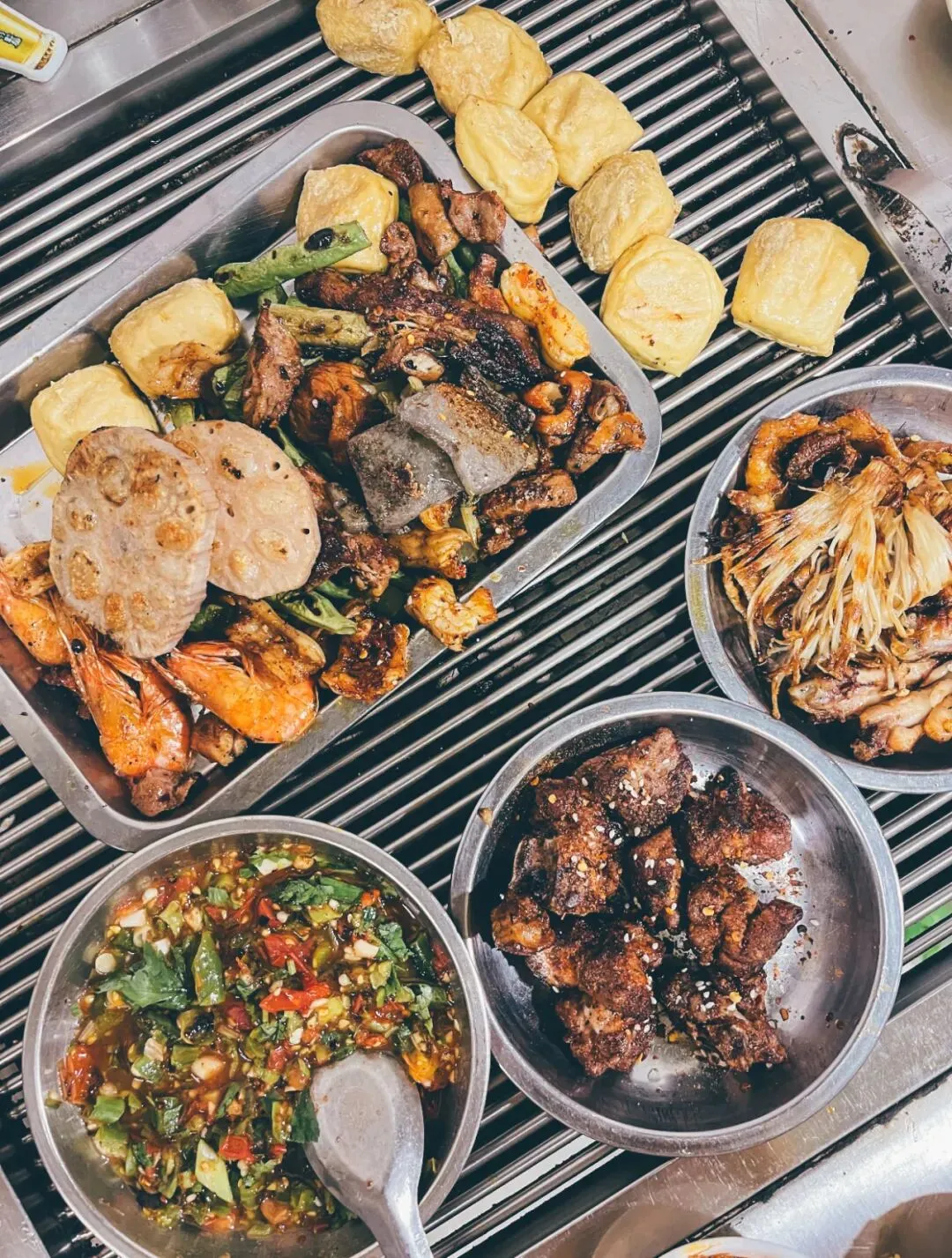 晚餐可以尝试“双双烧烤”,小红书上很多人推荐。人确实多,好几个小孩端着盘子满店跑,帮客人递菜。口蘑烤出的汁水是甜的,小番茄咬开爆汁,烫得直吸气也舍不得放筷。
