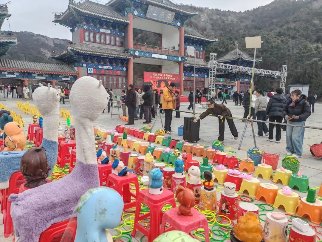 上午,凤凰山山门广场上,舞龙舞狮队伍翻腾跳跃,文艺演出热闹上演,锣鼓声与欢笑声交织。“跑黄河”九曲黄河阵在此开阵,这一民俗活动寓意“转九曲 消灾纳福”,游客在蜿蜒灯阵中穿梭,祈愿新年顺遂。同时,祈福园的祈福活动也同步启动,游客可参与问鼎祈福投球等活动,投个祈福球,许个新年愿,仪式感满满。