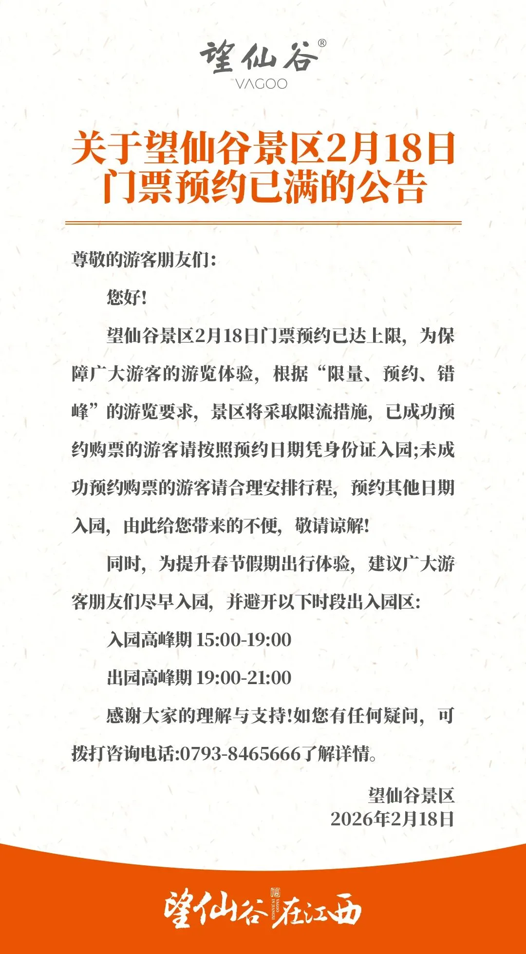 您现在的位置是:首页 > 国内旅游目的推荐 > 正文 国内旅游目的推荐 关于望仙谷景区2月18日门票预约已满的公告 admin2026年02月18日 10:58:57国内旅游目的推荐11 关于望仙谷景区2月18日门票预约已满的公告来源 | 望仙谷—THE END— 转载请说明来源于"旅荐网",部分内容转载自网络,如有侵权请联系qlwl@foxmail.com删除 本文地址:https://www.15386.cn/post/112550.html 上一篇 旅游~你入门了吗 下一篇 开开心心的春游,继续下一个景区:壶口瀑布 相关文章 【五一路线4】自驾南太行;2天—4天可以自由选择!南太行经典景点+昆山挂壁公路穿越! 南澳岛3天2晚保姆级攻略|附景点、美食、住宿、交通与避坑,可直接照着走! 干货!拉萨自由行攻略! 春假来临,临沂孔庙旅行指南,请查收~ 五一假期•旅游攻略!广东省品质纯玩线路汇总,海岛/乐园/温泉/五星/美食,精品2-4天游线路任您选! 国庆小长假旅游路线,提前规划不踩坑! 五一必去!7条江浙沪皖周边绝美自驾路线,太有用了赶紧收藏!直接走起! 越南旅游全攻略:从签证到回国 五台山旅游攻略二日游 旅游攻略 | 2026欧洲黄金季开启! 这个夏天,我要去多洛米蒂当神仙 发表评论 取消回复 评论列表 这篇文章还没有收到评论,赶紧来抢沙发吧~