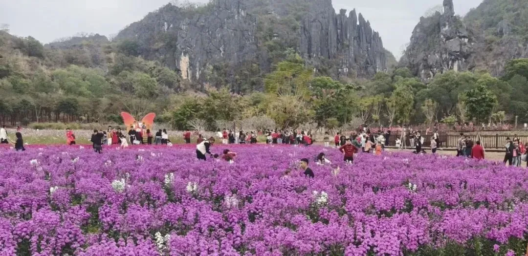 漫山花海肆意绽放,与喀斯特石林相映成趣