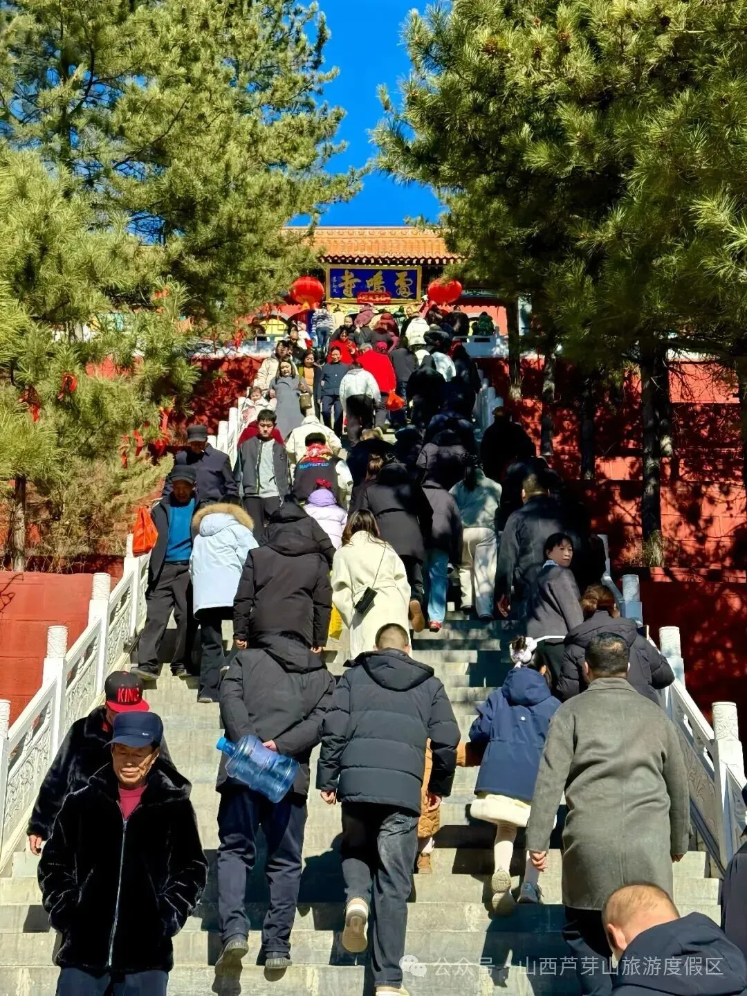 汾河源头景区内香火鼎盛、人流如织。庄严古朴的石牌坊下,游客们有序驻足,或拍照留念定格新春记忆,或缓步前行探寻母亲河的发源秘境。寺庙袅袅香火寄托着人们对新一年的美好期许,祈福的游客络绎不绝,大家手持香火,在工作人员的引导下文明祈福,将对家人的安康祝愿、对生活的美好憧憬融入每一份虔诚之中。苍松翠柏掩映间,红墙黛瓦与湛蓝天空相映成趣,传统文化的厚重底蕴与新春佳节的喜庆氛围在此完美交融。