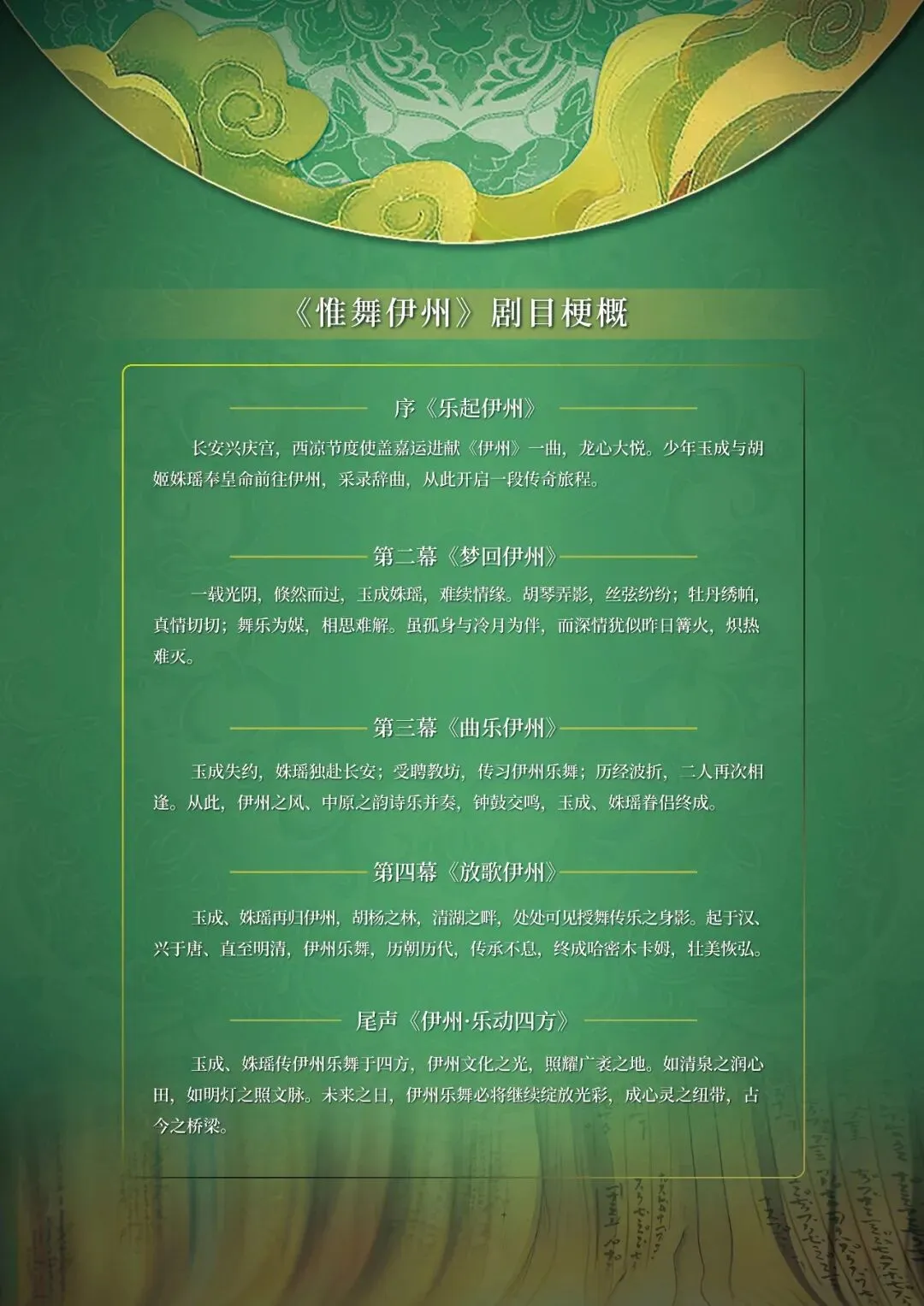 《惟舞伊州》以伊州女子姝瑶与长安少年玉成的爱情故事为主线,通过音乐、舞蹈与诗歌的融合,展现伊州乐舞从诞生到传扬四方的历程,生动呈现伊州与中原文化的深度交融。《惟舞伊州》由序《乐起伊州》、第一幕《情定伊州》、第二幕《梦回伊州》、第三幕《曲乐伊州》、第四幕《放歌伊州》以及尾声《伊州·乐动四方》组成。每幕精心编排,带领观众走进充满历史韵味与文化魅力的场景。